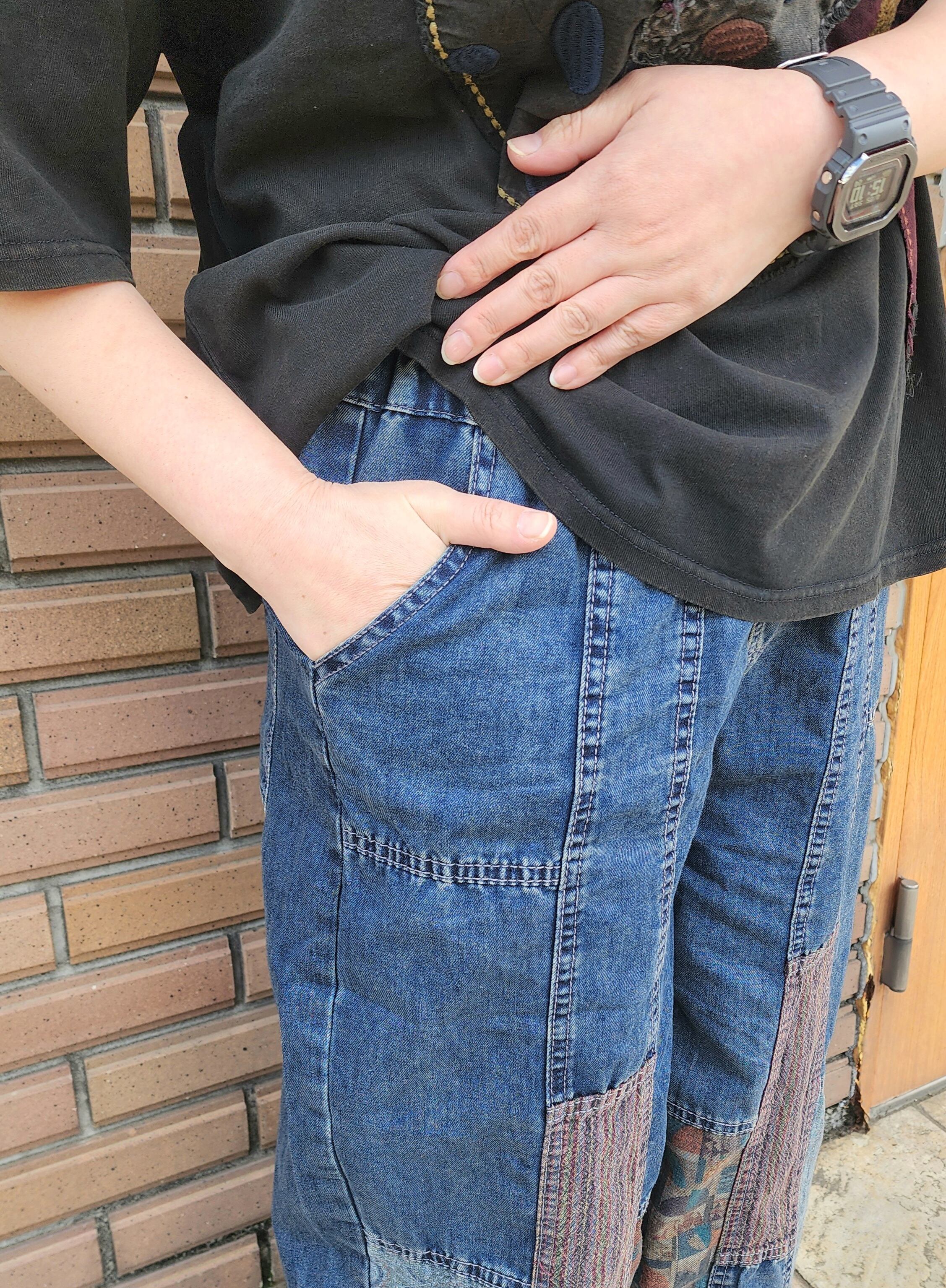 デニム×柄のパッチワークデニムパンツ。