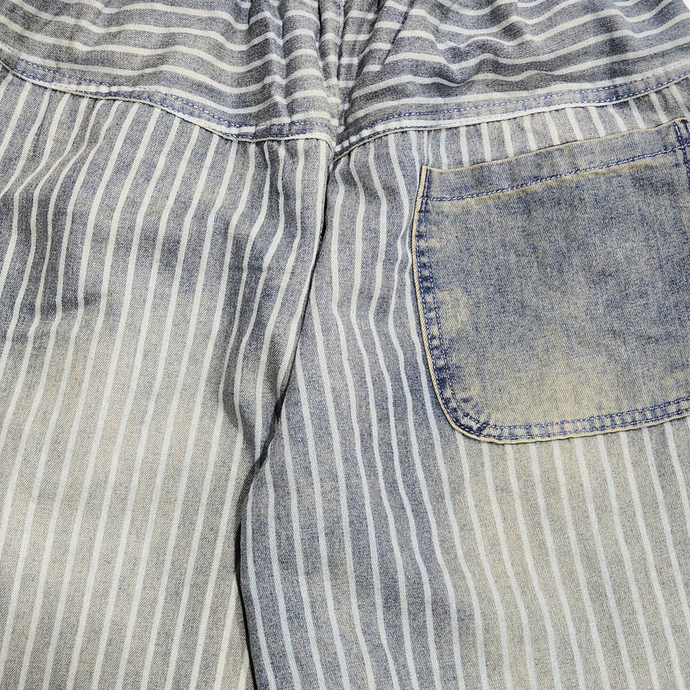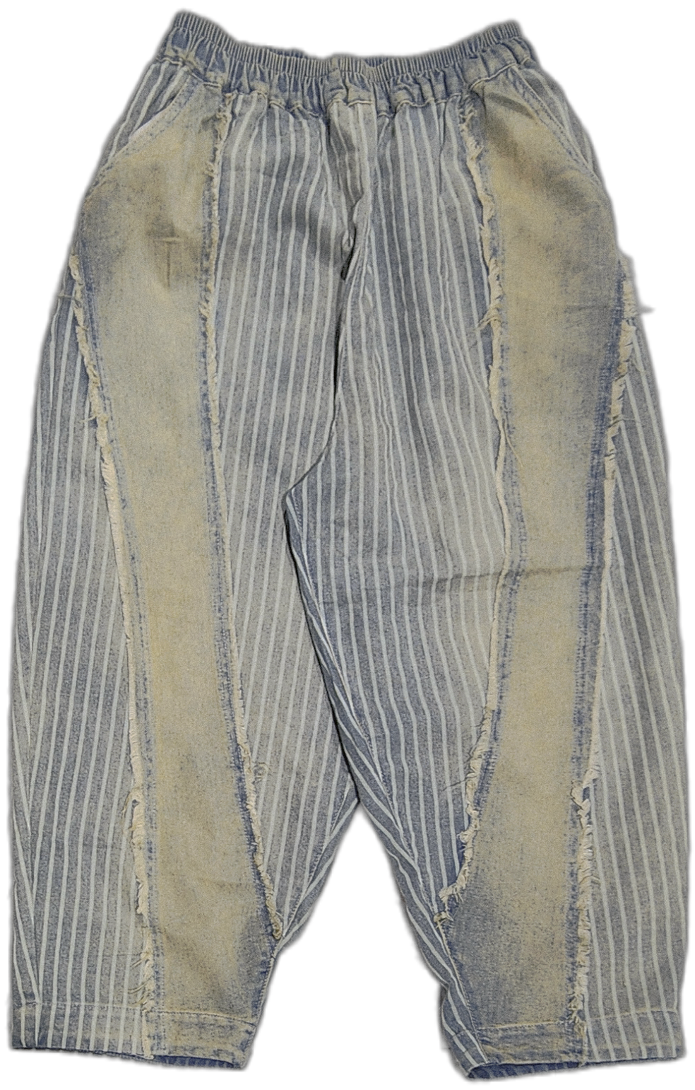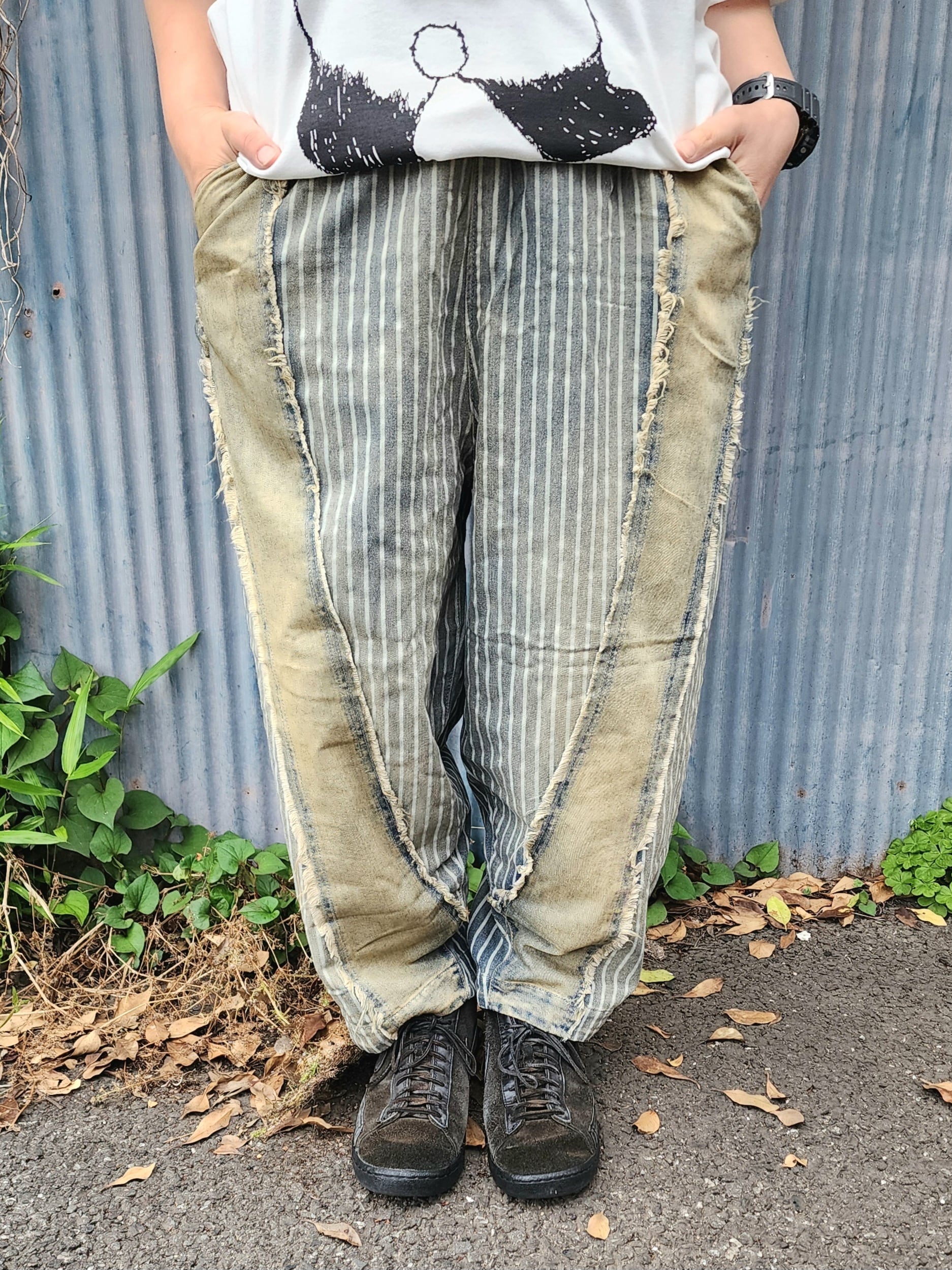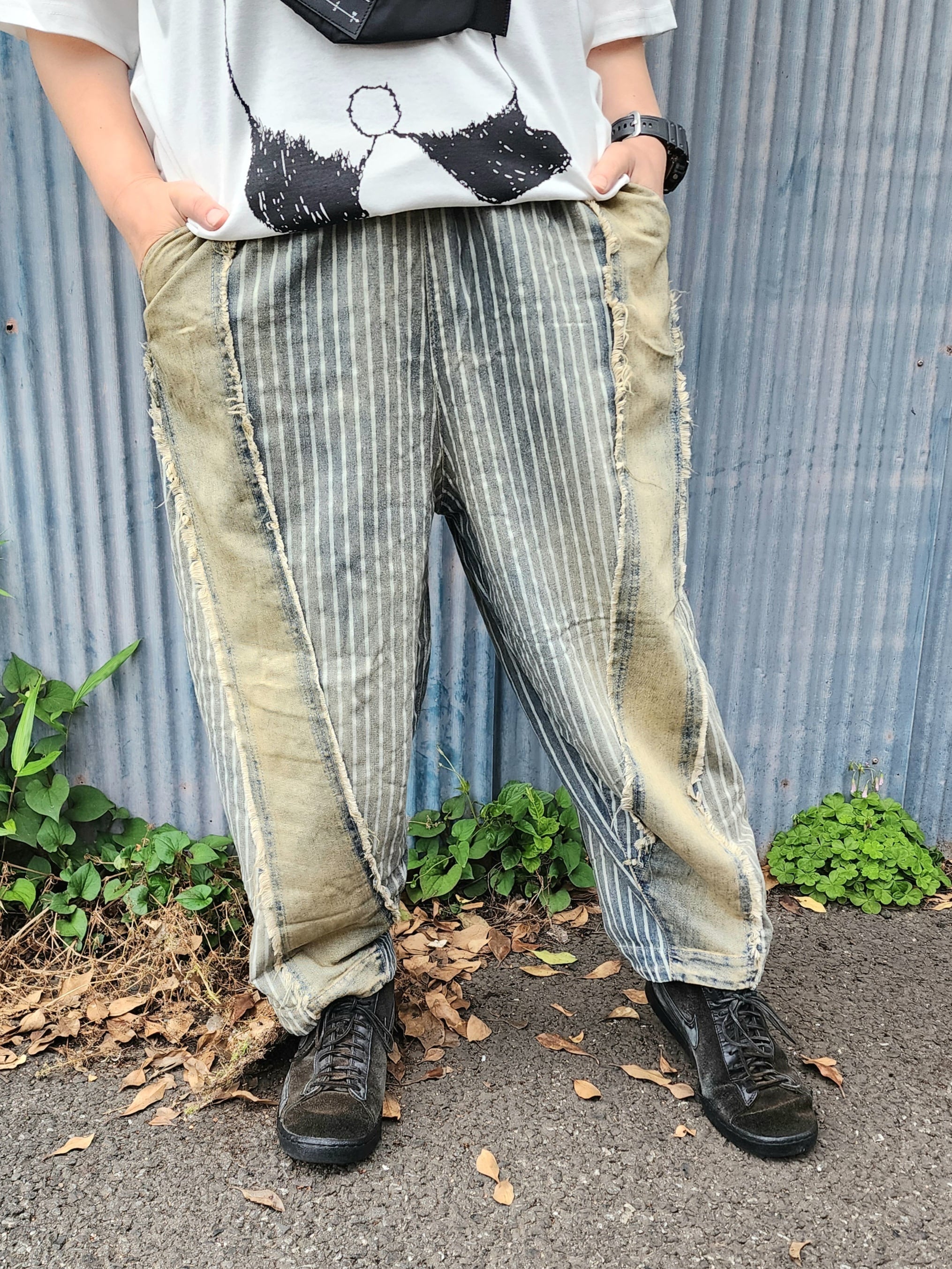 ストライプデニムにカットオフデニムを組み合わせたゆったりパンツ。