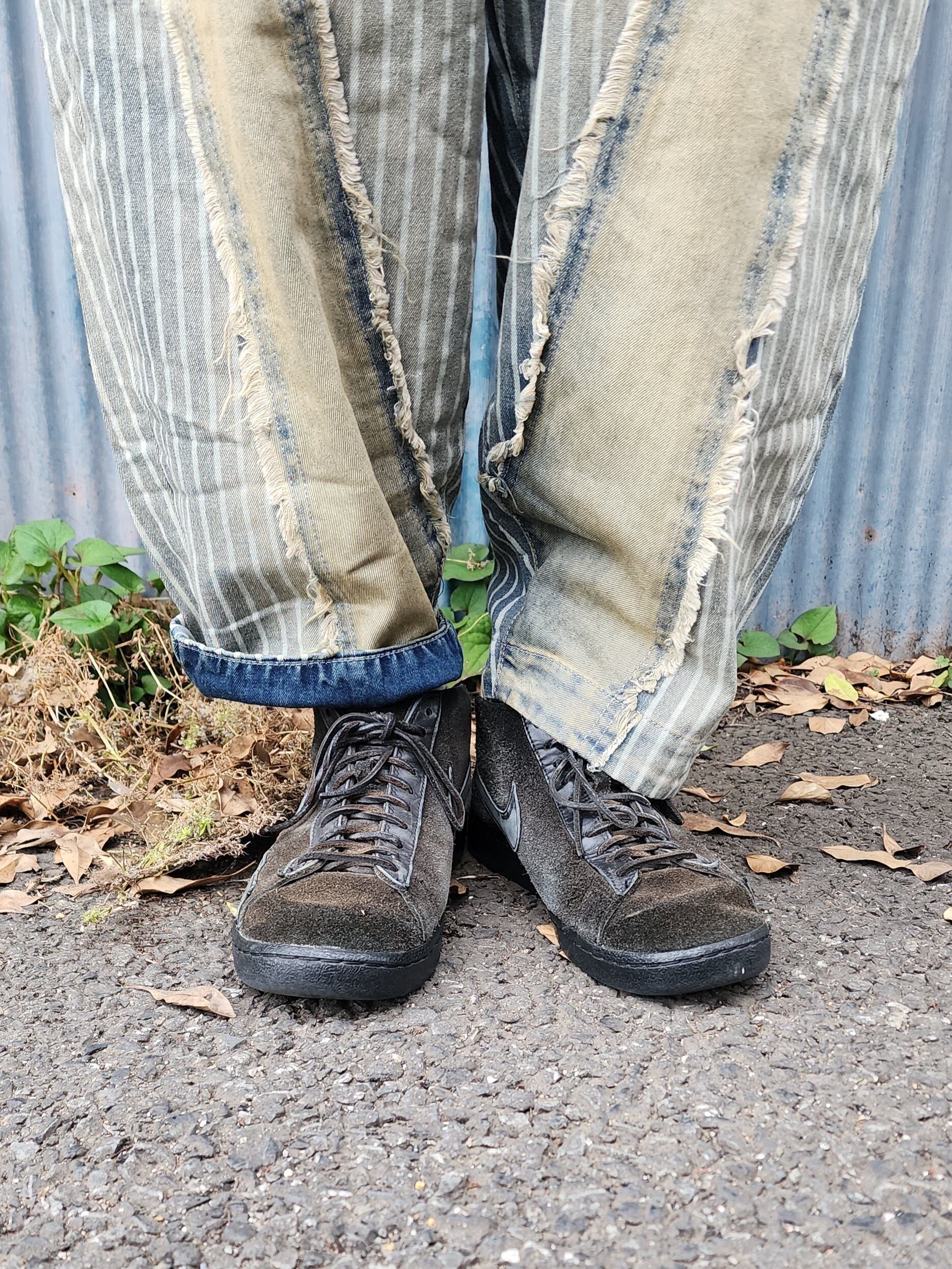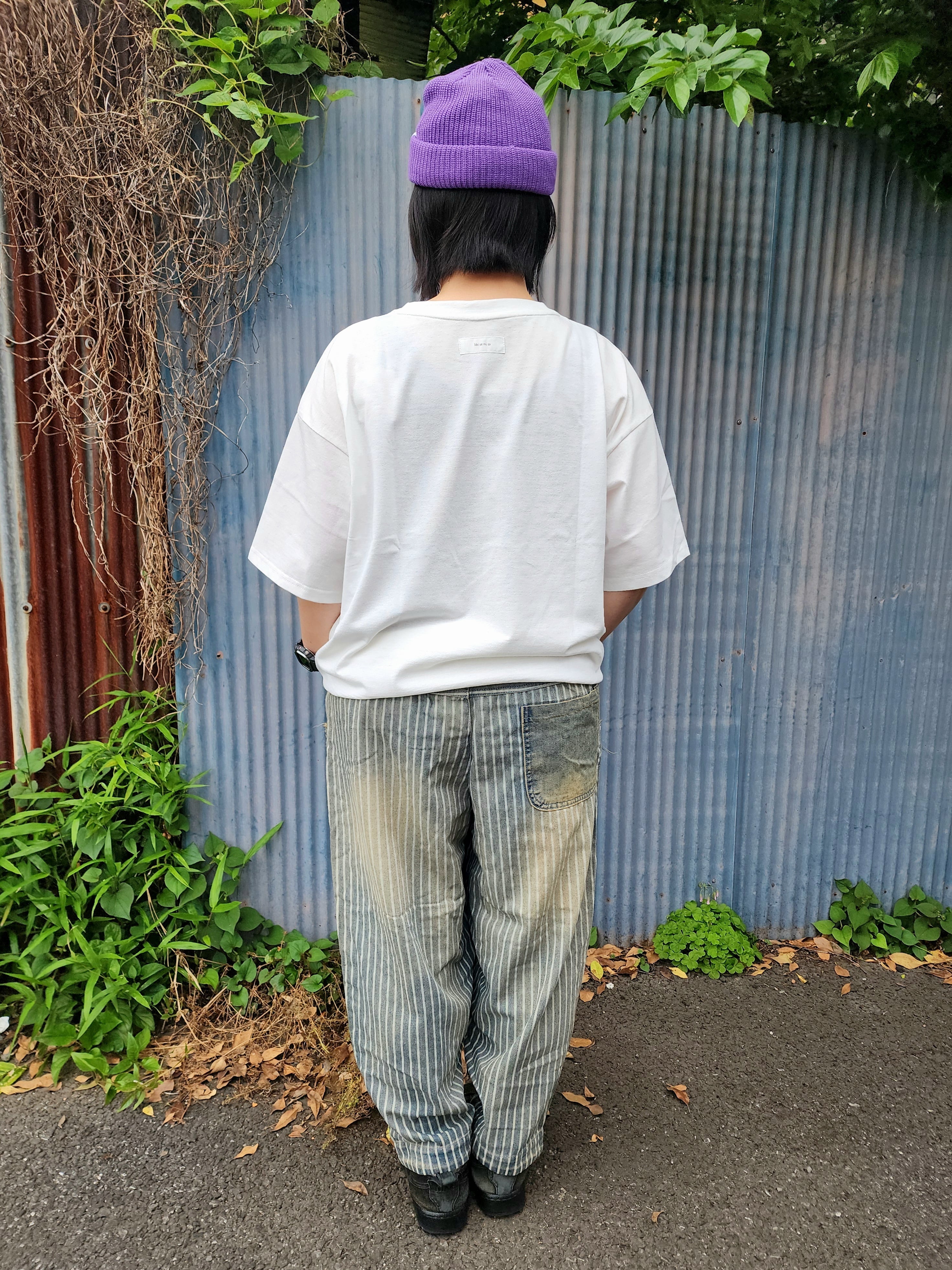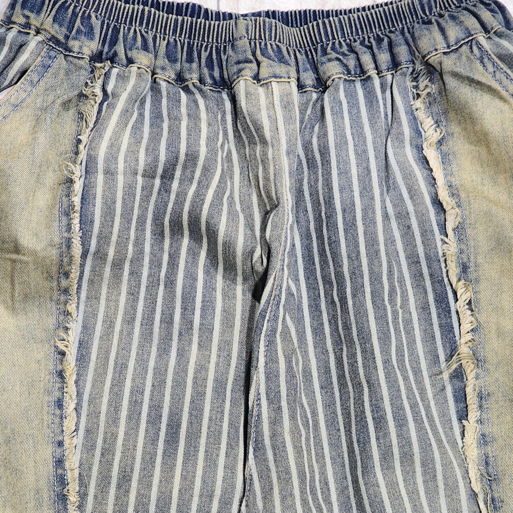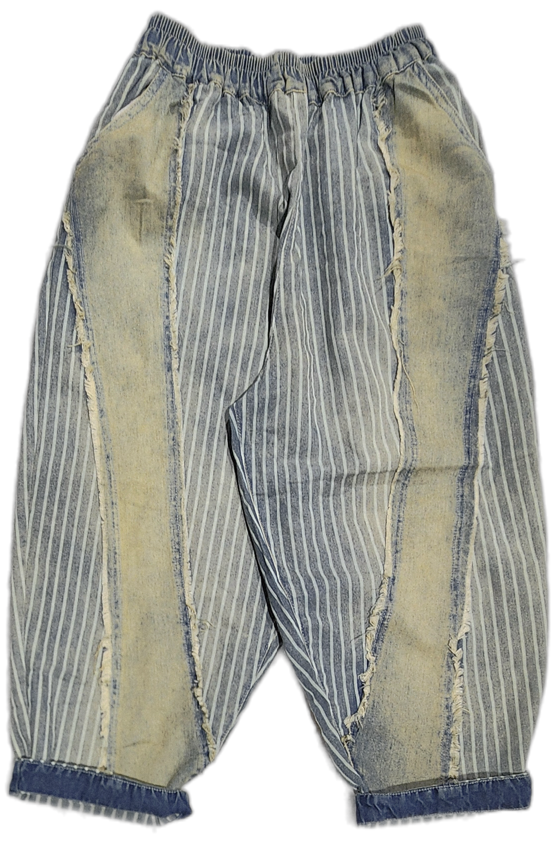 ストライプデニムにカットオフデニムを組み合わせたゆったりパンツ。