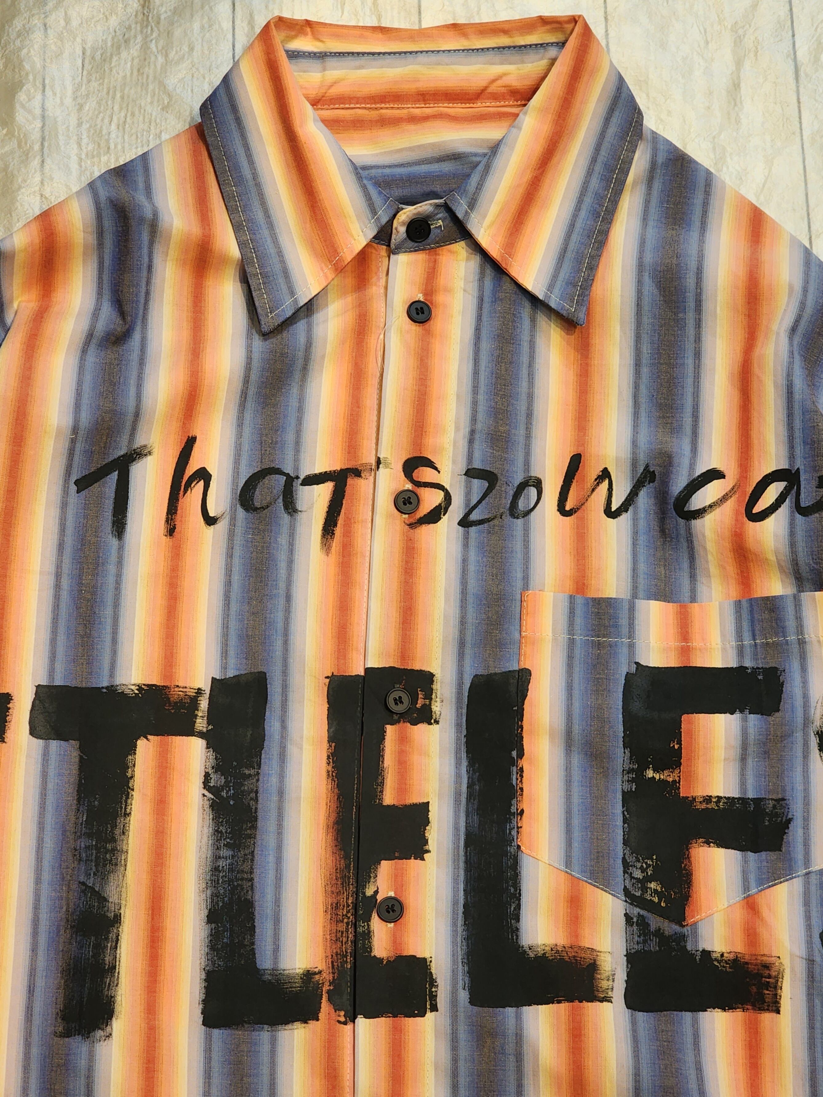 グラデーションストライプに落書き風ロゴプリントがクールなシャツ。
