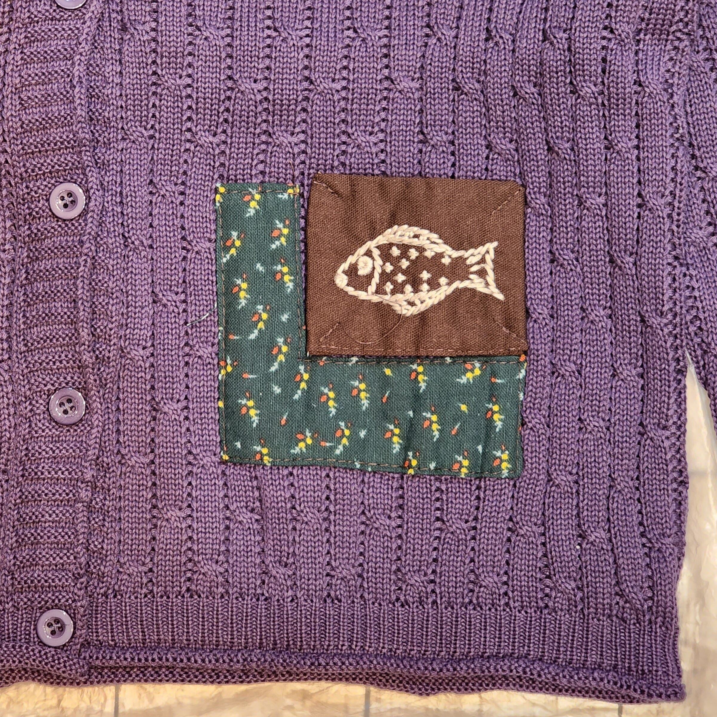 お魚の刺繍が施された布と花柄生地をパッチワークしたVカーデ。