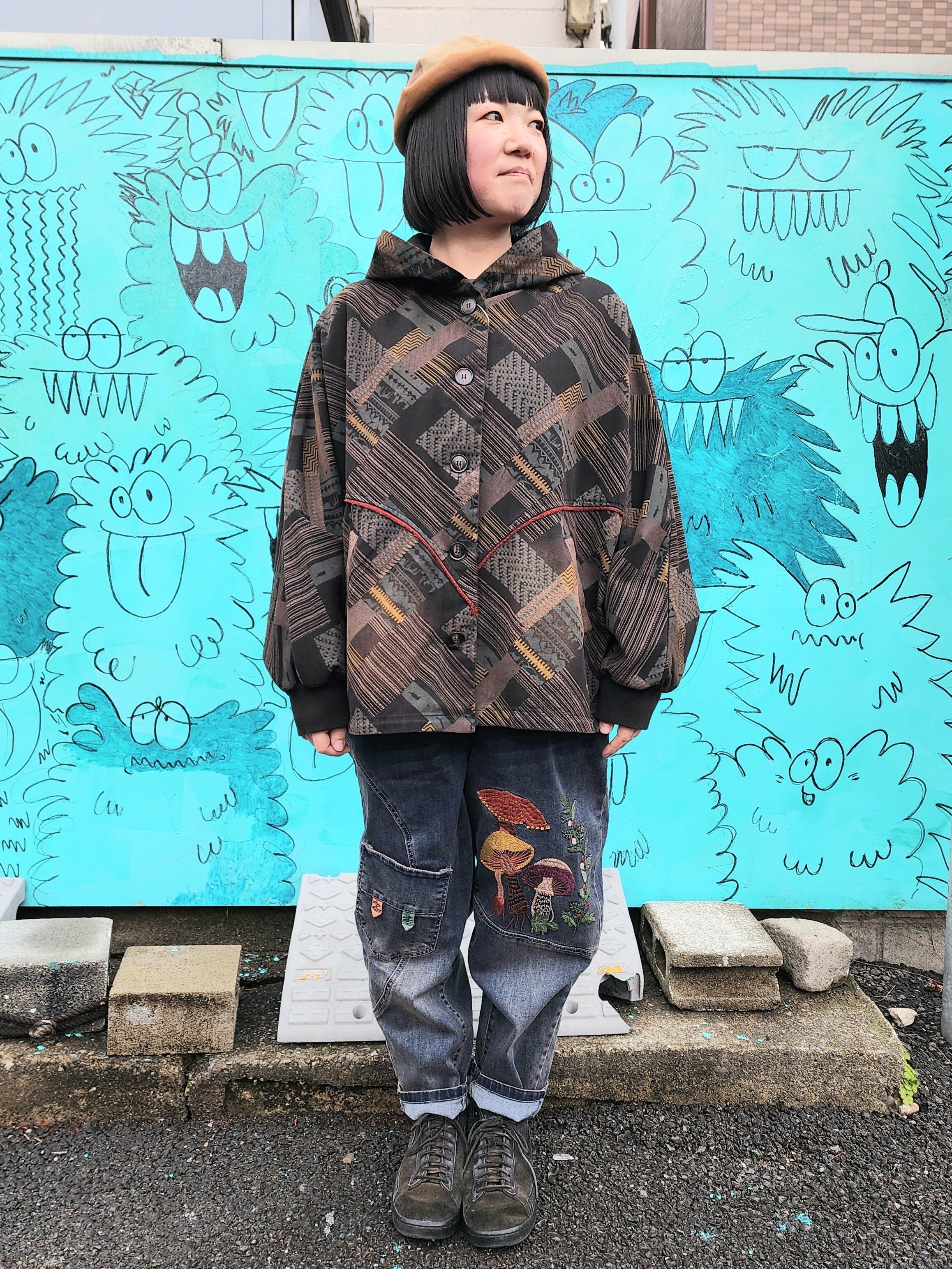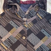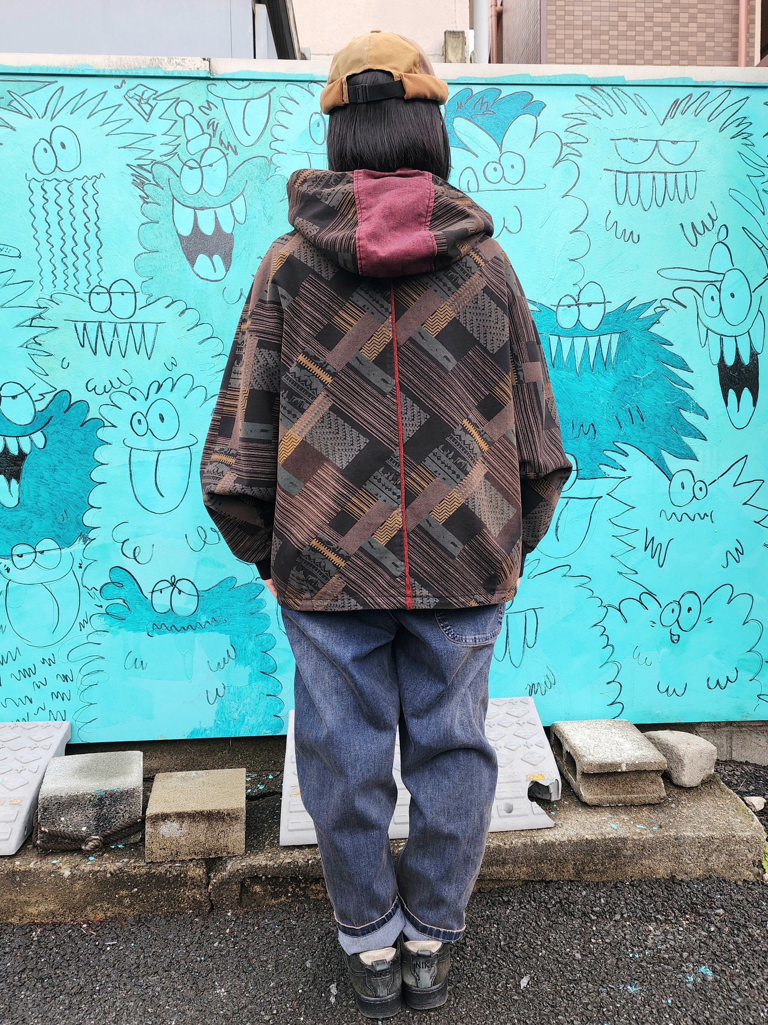パッチワークプリントの様な、色々な四角柄を組み合わせたプリントが珍しいアウターです。