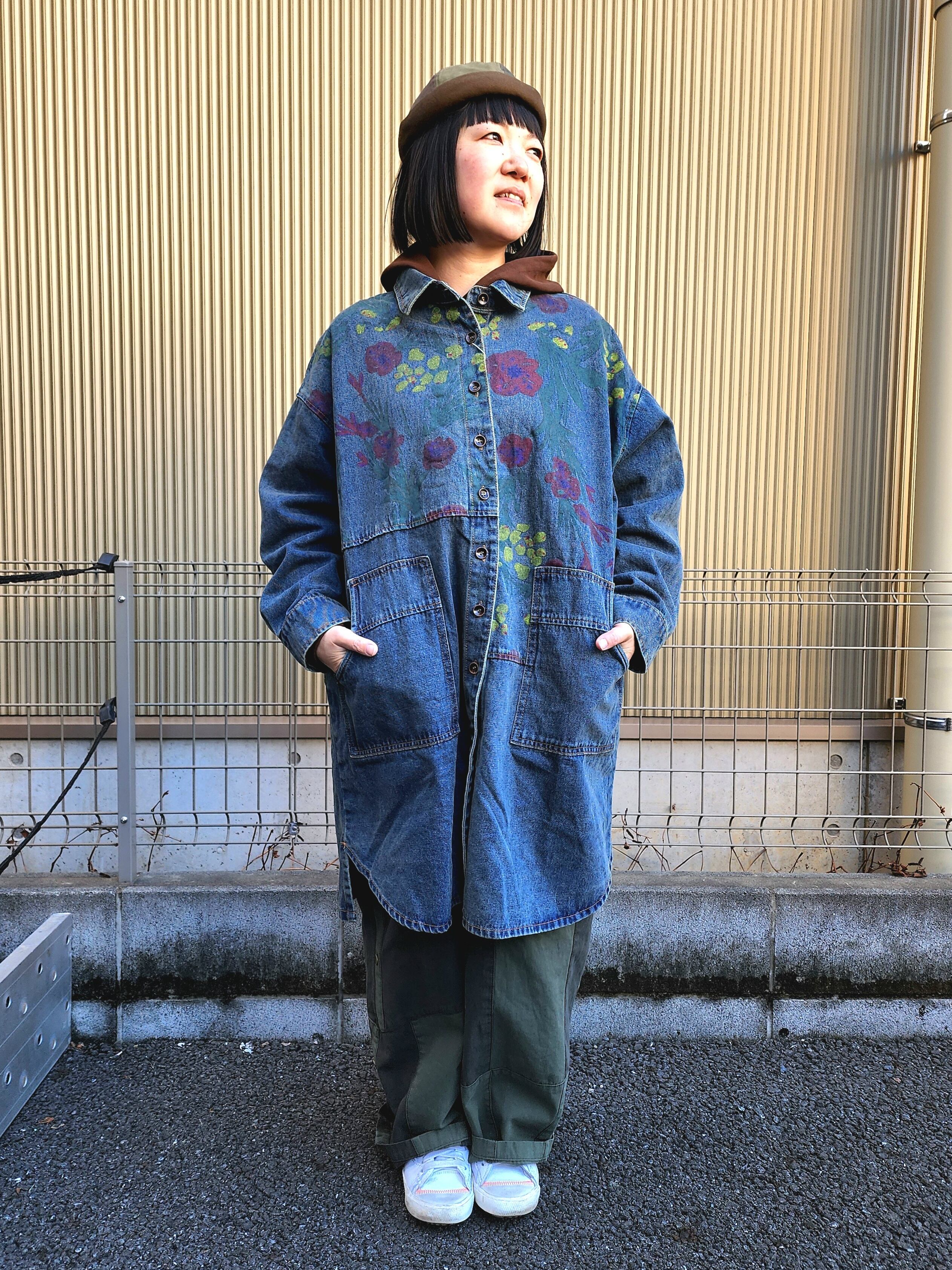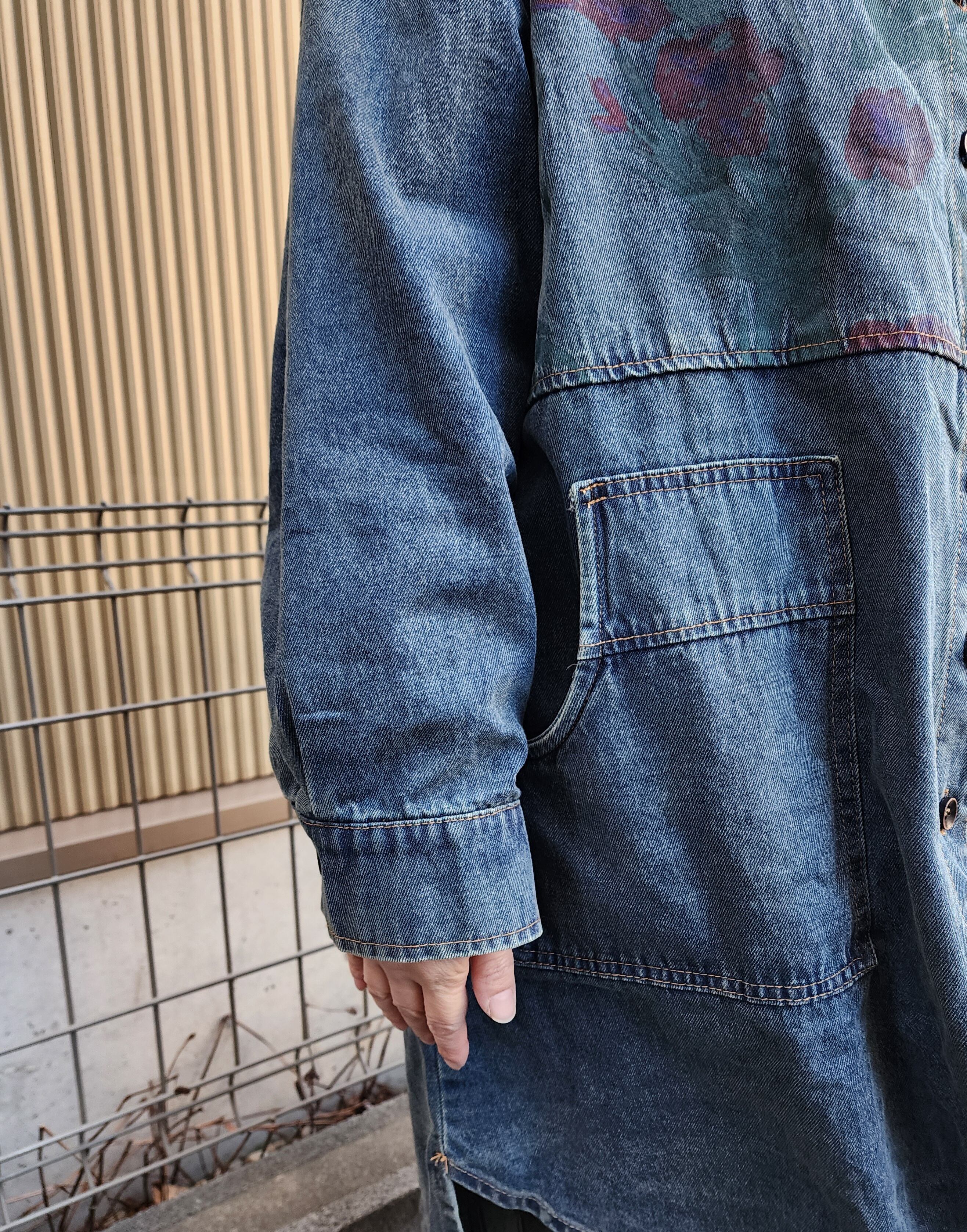 お絵描き花プリント×無地デニム切替のデニムアウター。