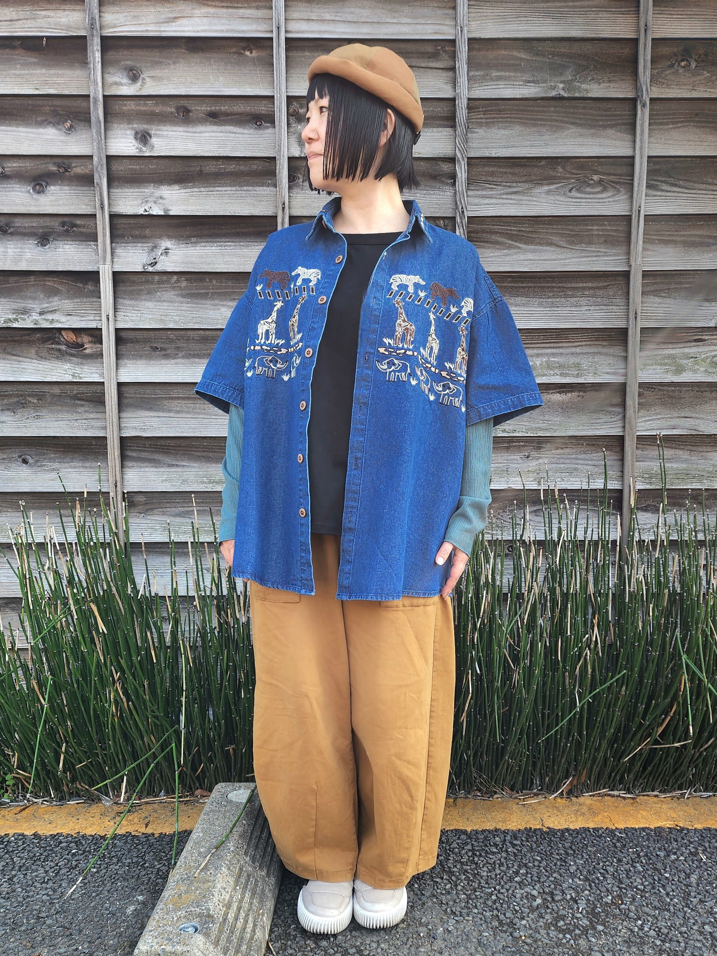 シマウマやキリンやゾウがレトロな刺繍で施されたデニムシャツ。