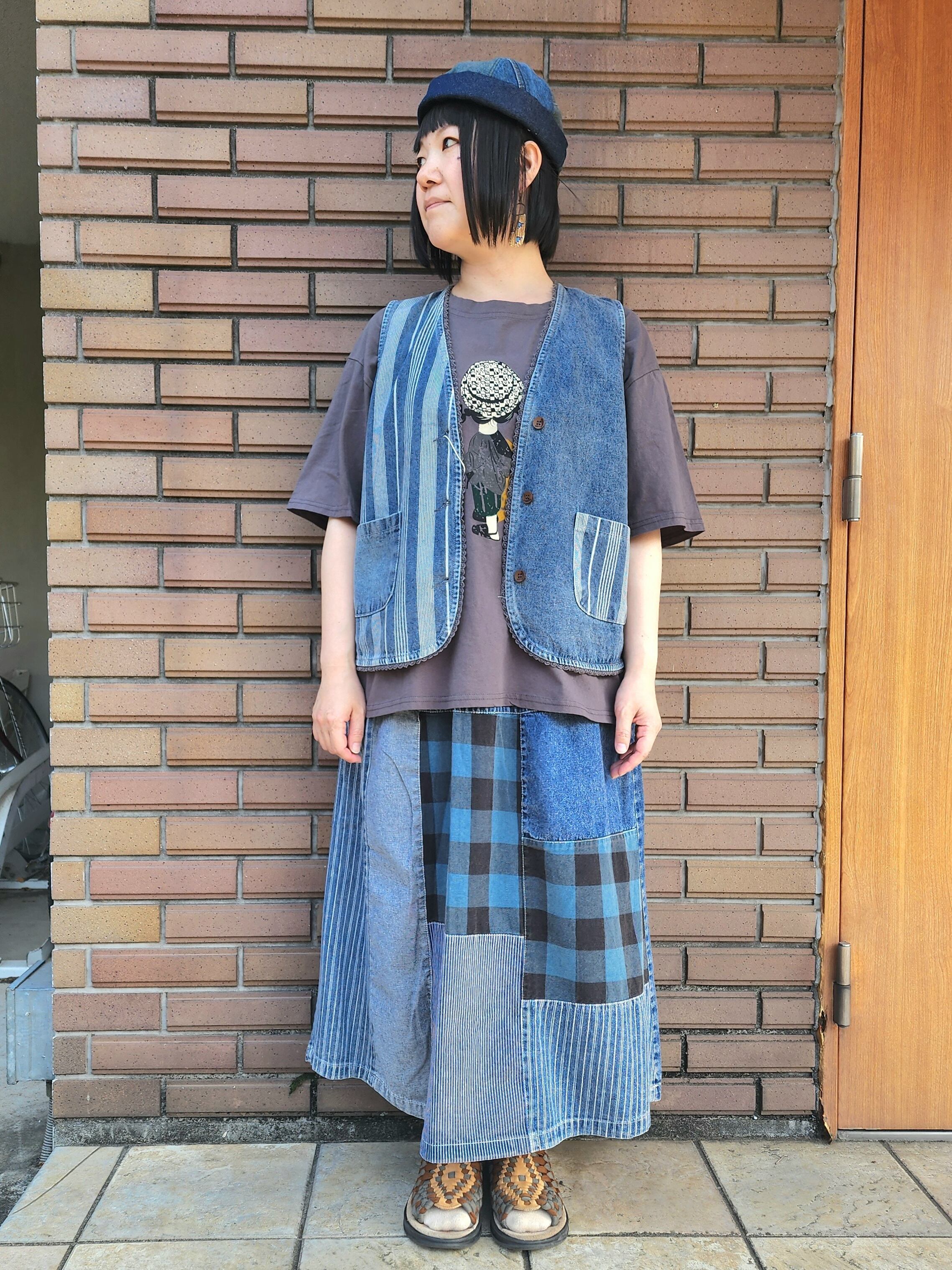 パッチワークスカートでもストライプやチェックなどブルー系でまとめているので、意外と使いやすいです◎