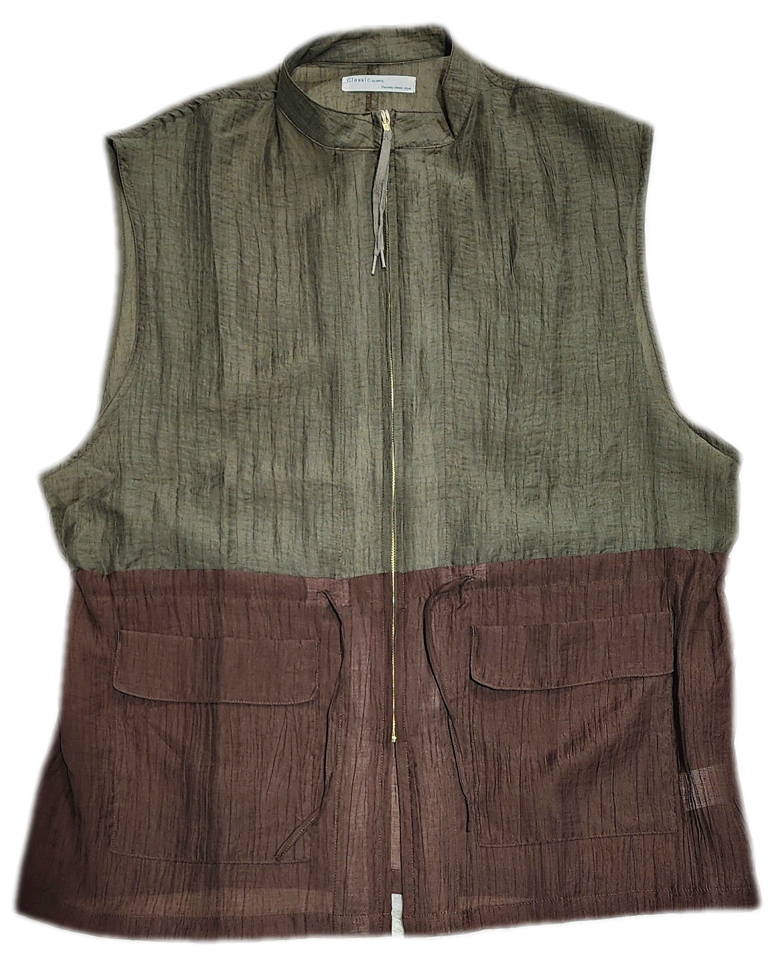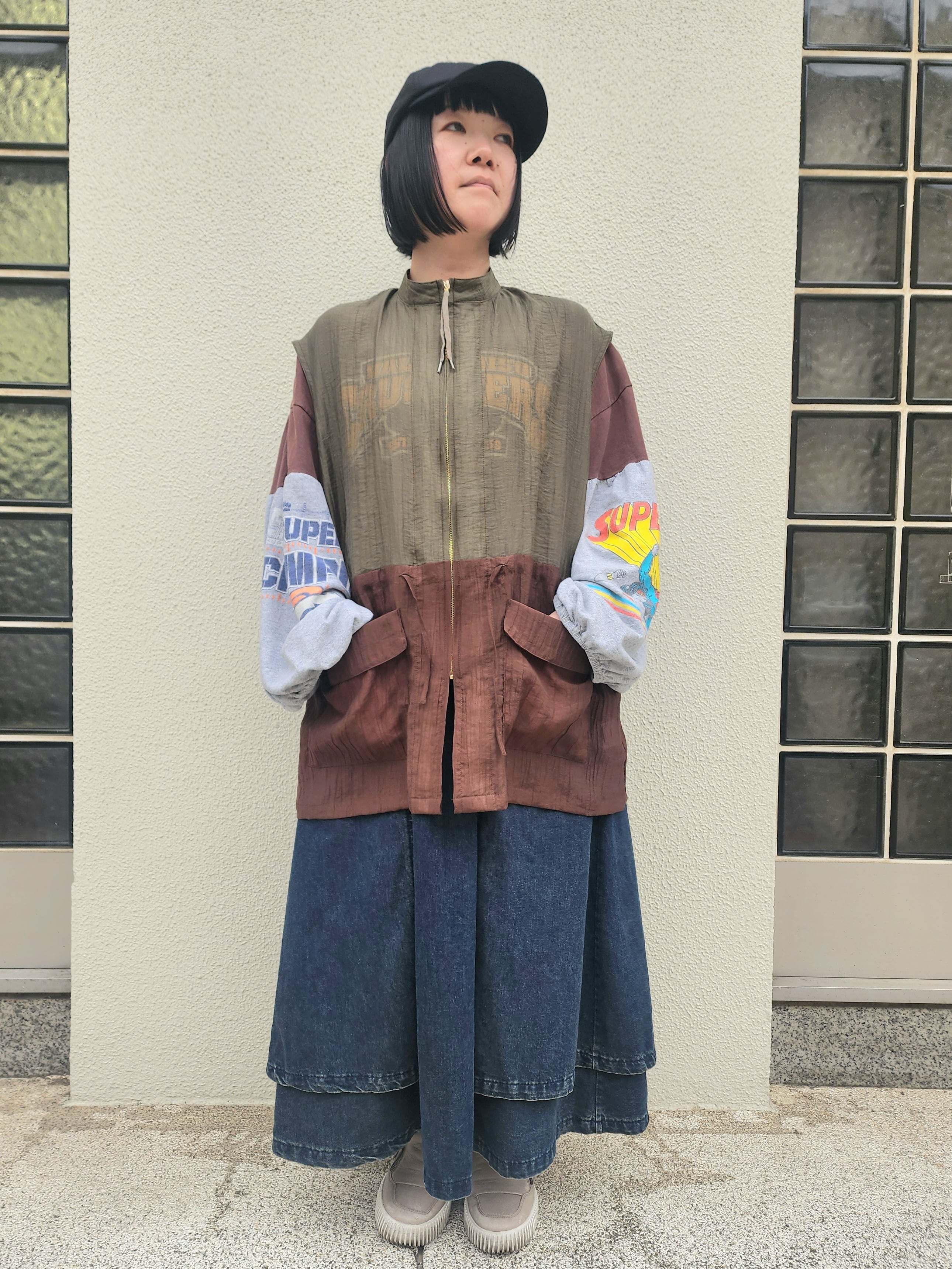 シブ可愛い配色に味のある楊柳生地が素敵なジップベスト。