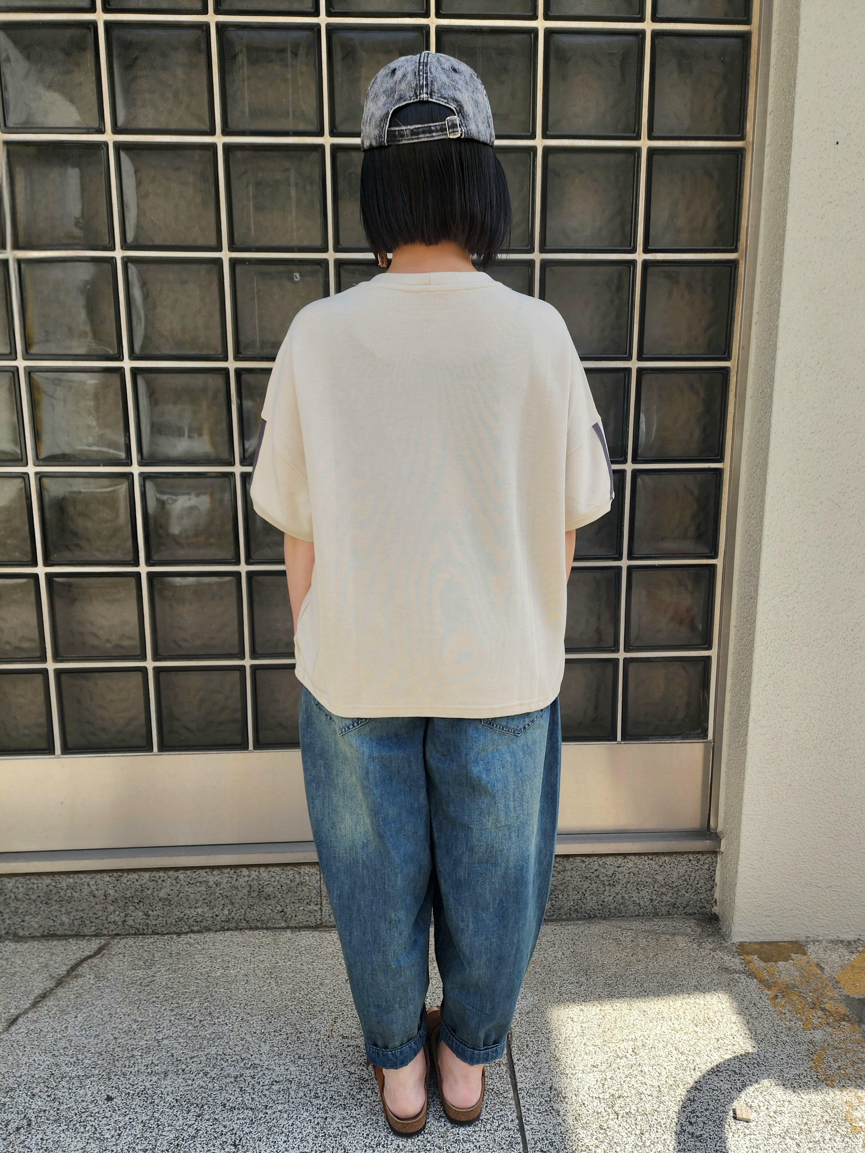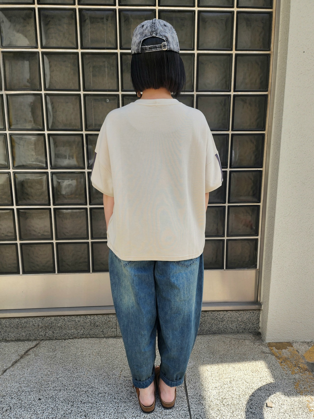 ドロップショルダーの五分袖で、裾には紐が通っていてコードストッパーでとめて着ることも可能です。