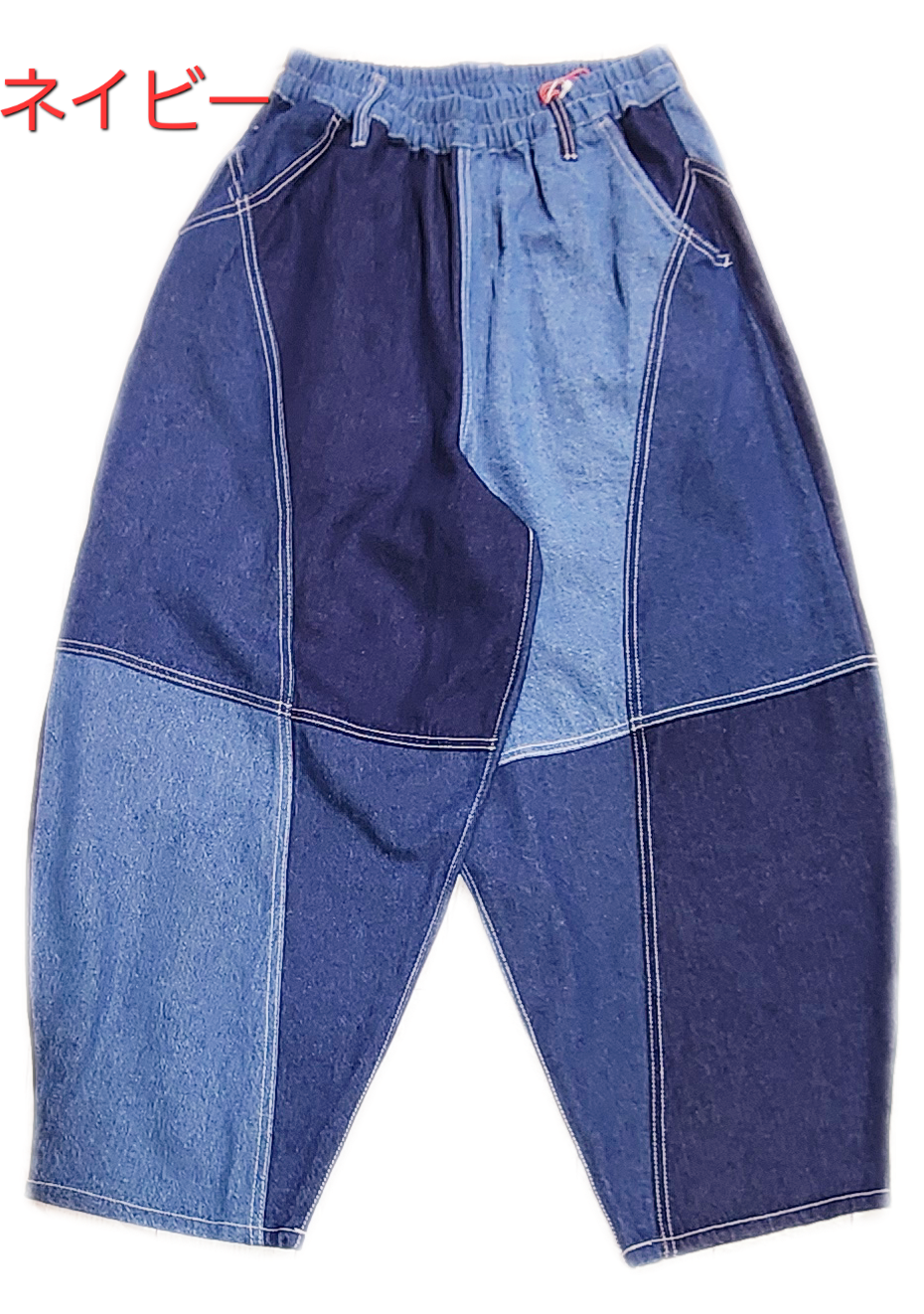 濃淡3色のデニム生地で切り替えたゆったりデニムパンツ。