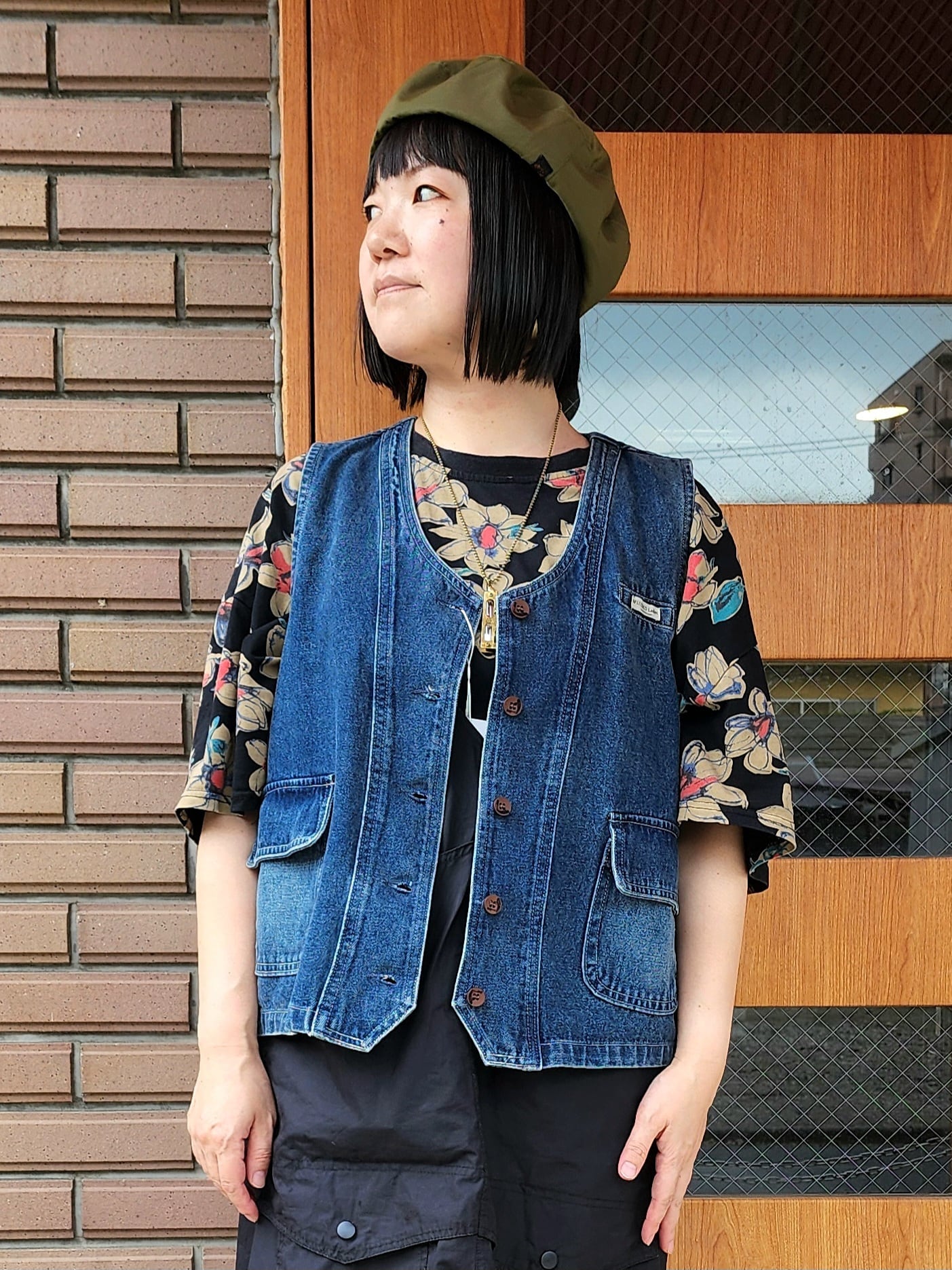 フラップ付きのポッケが付いたシンプルなデニムベスト。