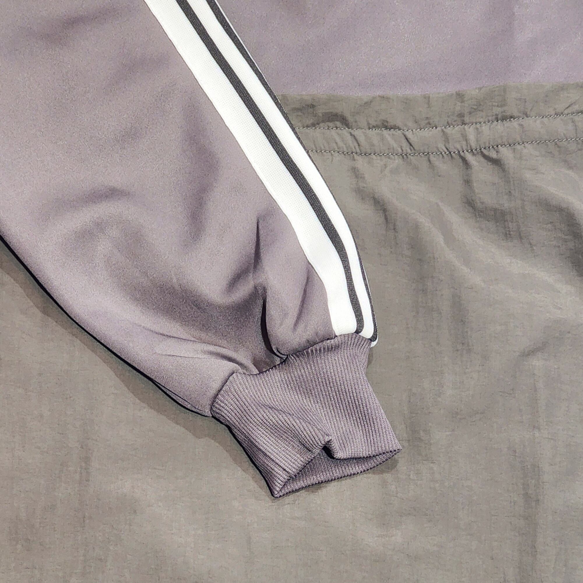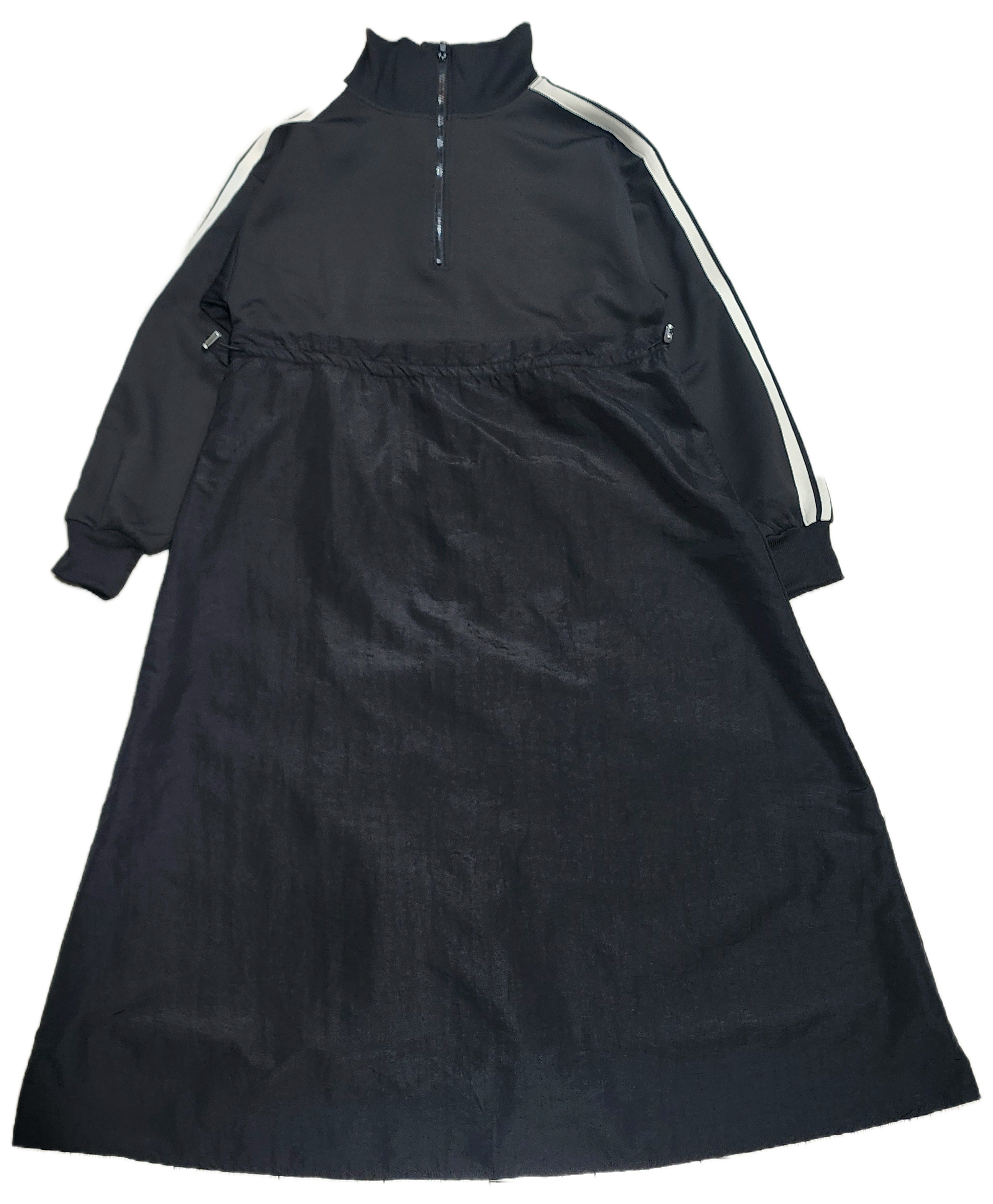 上を三本ライン入りのジャージ、下はナイロン素材で切り替えた異素材切替ワンピース。