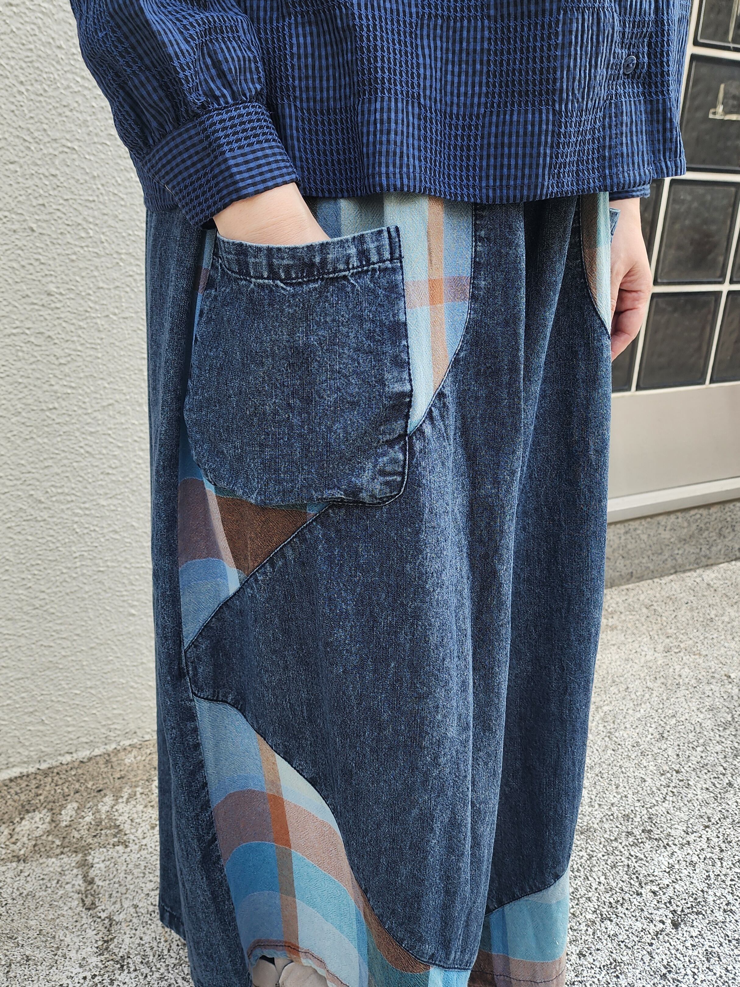 大きなチェック切替デニムガウチョパンツ