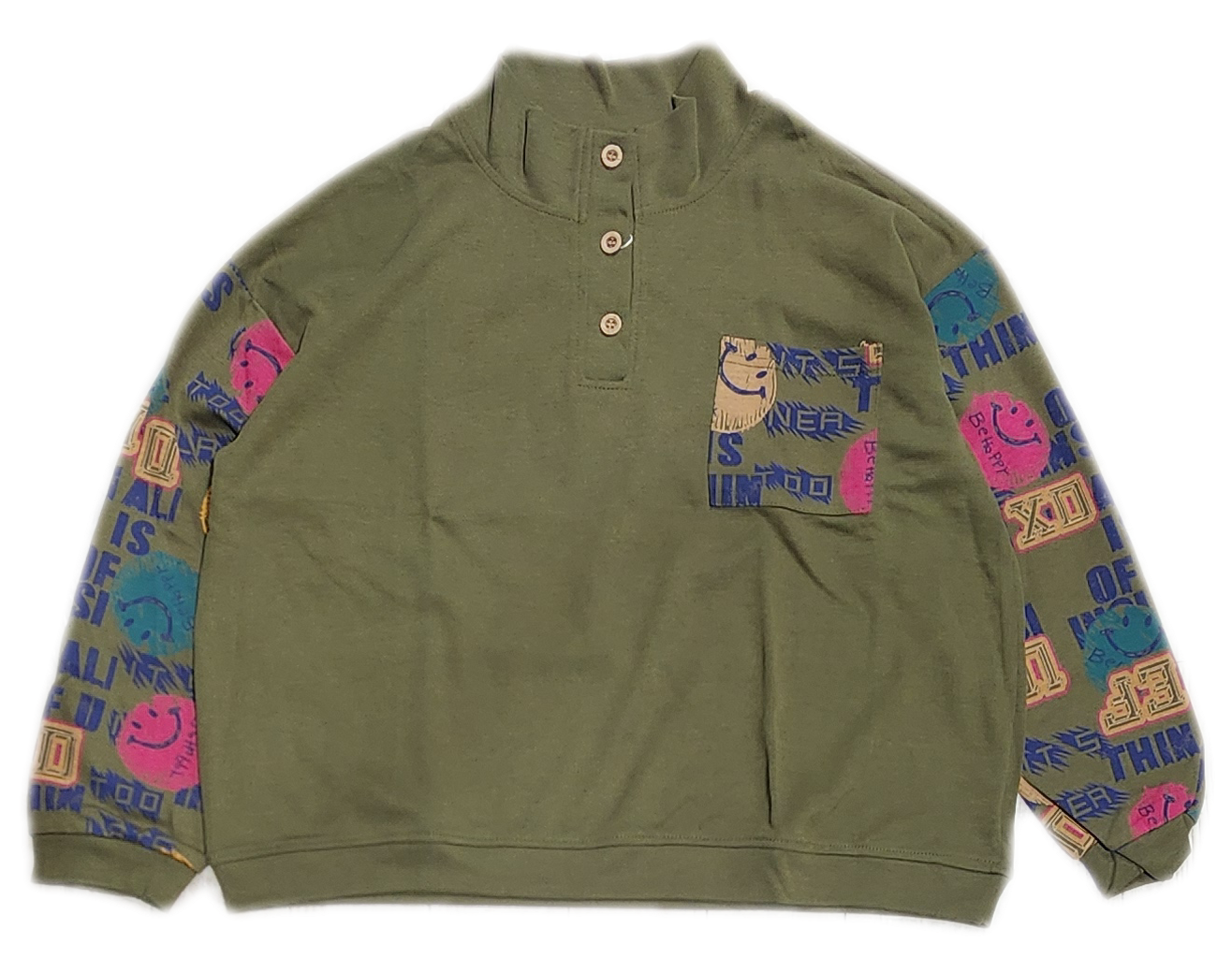 人気モチーフのスマイル×英字プリントで袖とポケットを切り替えたハイネック。