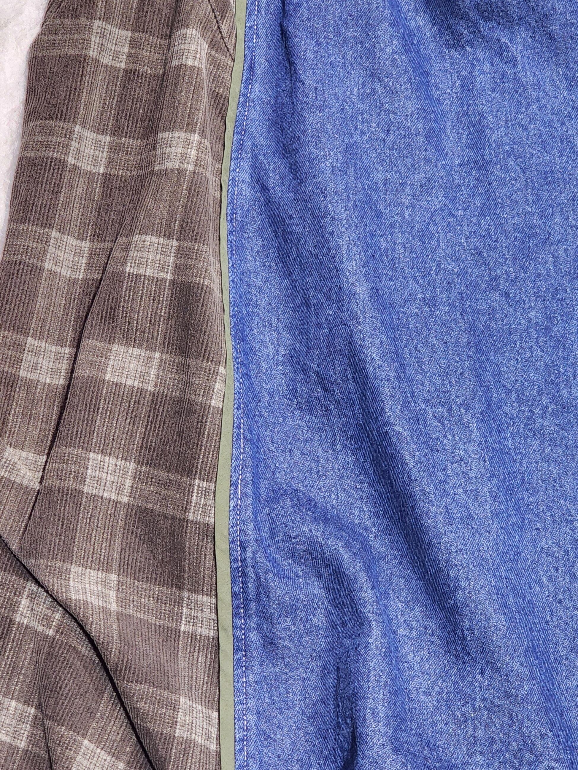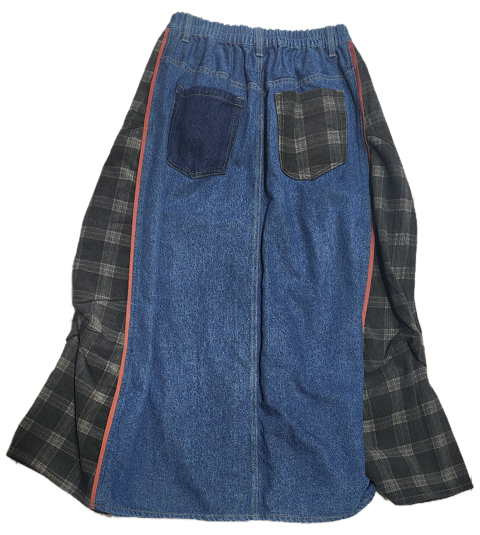 デニムにサイドをチェックコーデュロイで切り替えたロングスカート。