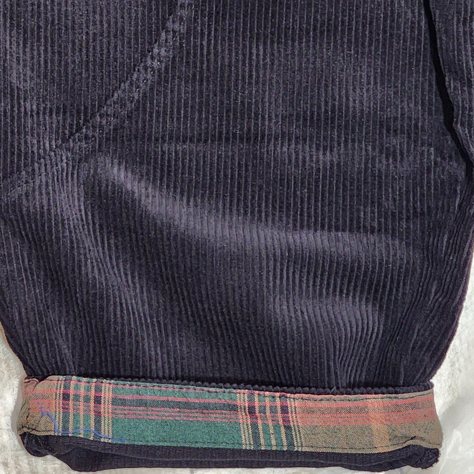 裾裏やポケット口をチェックの別布で切り替えたコーデュロイパンツ。