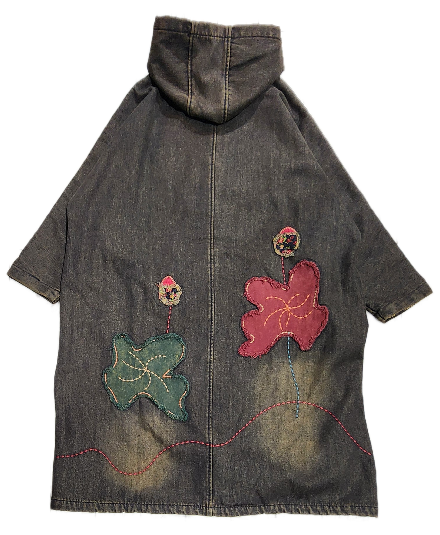 ユーズドブラックのデニム生地に、お花や魚のモチーフのパッチワーク&刺繍が可愛いです。