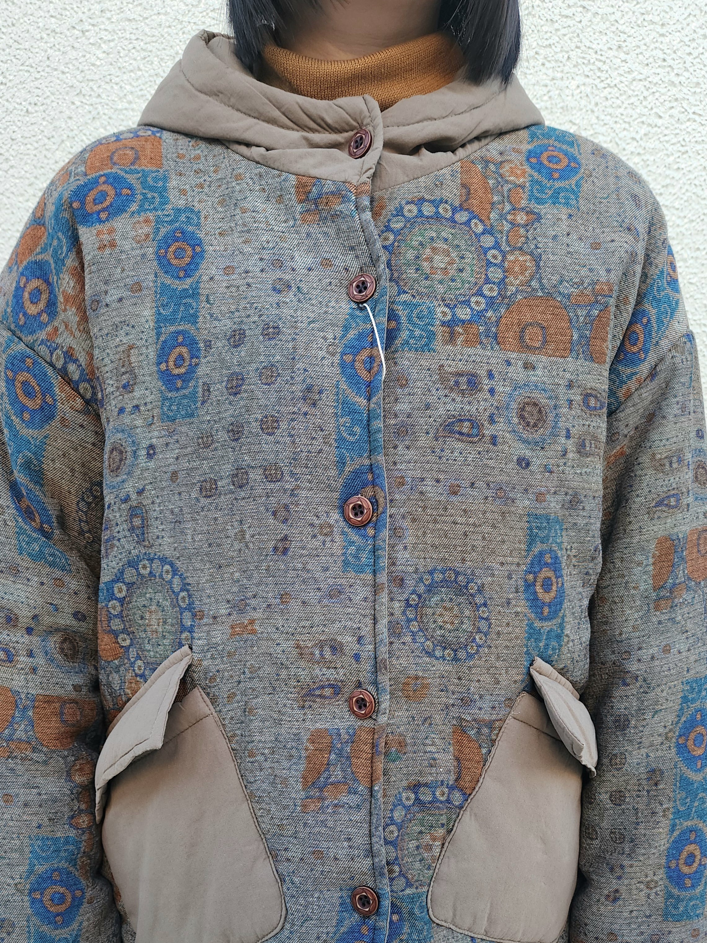 フード付きで首元まで釦が付いているので、首元まで暖かく着られます。