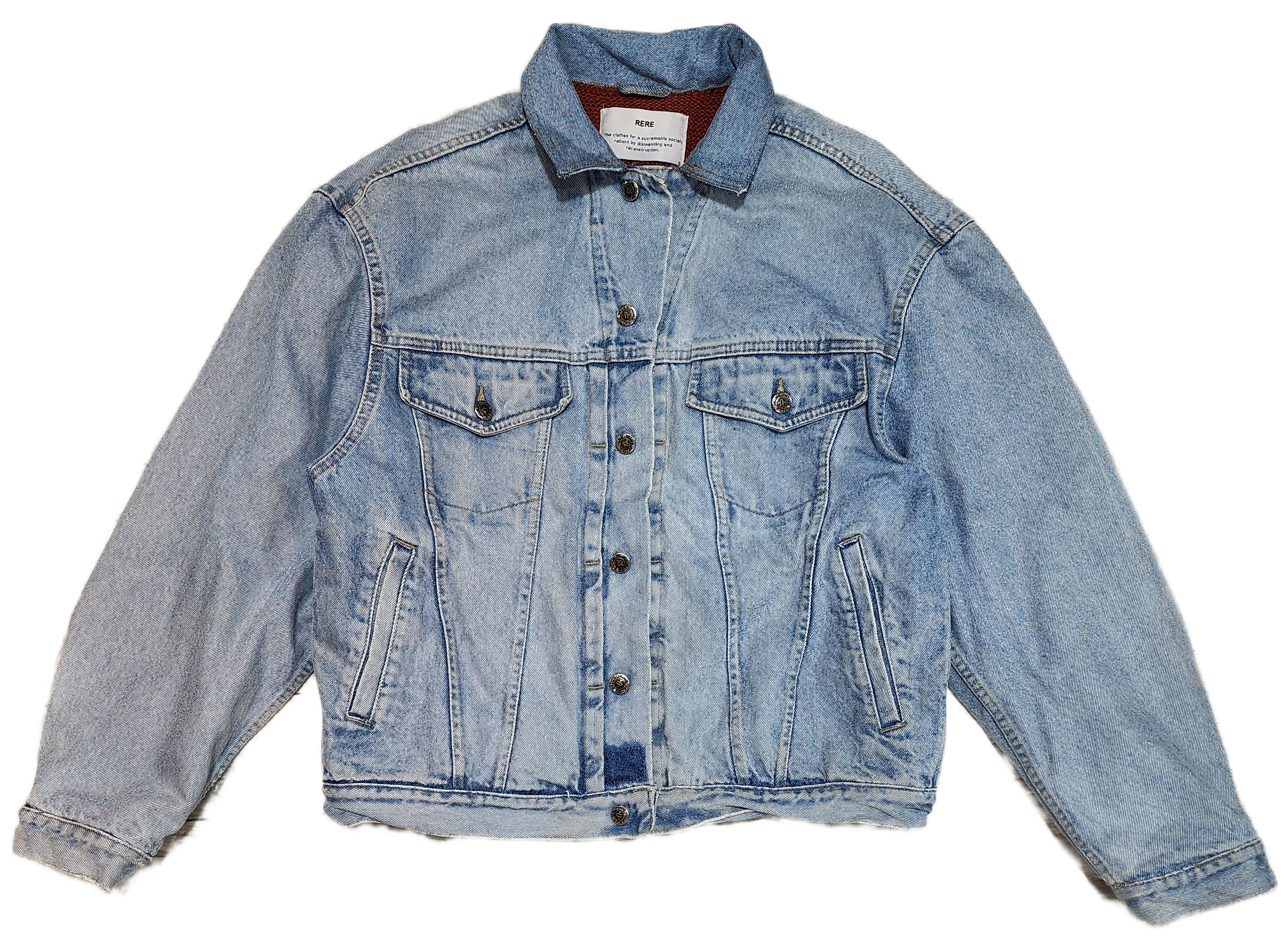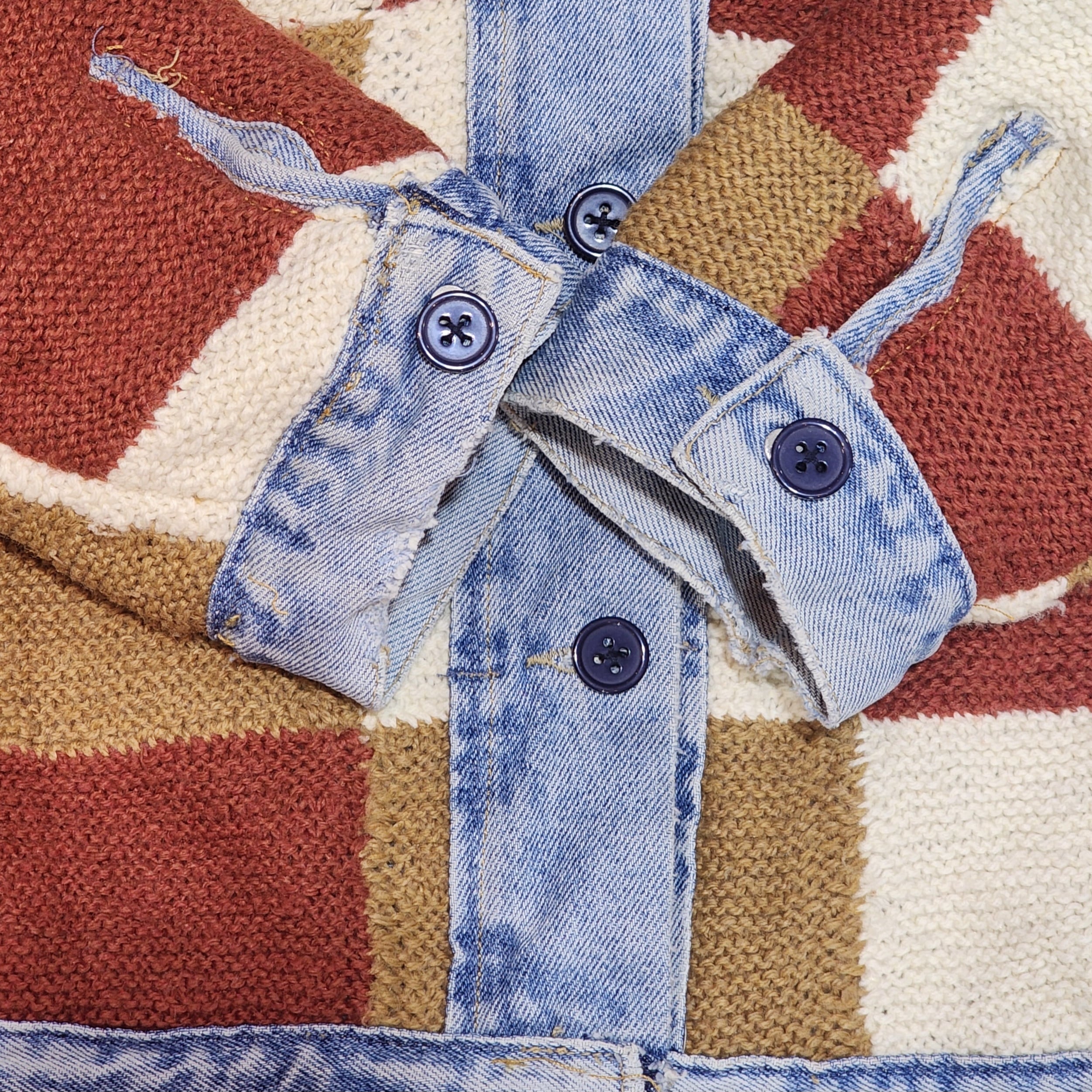 ☆古着のリメイクの為、袖口や襟や前立てなどにダメージ箇所も見られます。デニムの退色やニットの毛羽立ちやピリング等もございますが、古着独特の個性としてお楽しみください☆