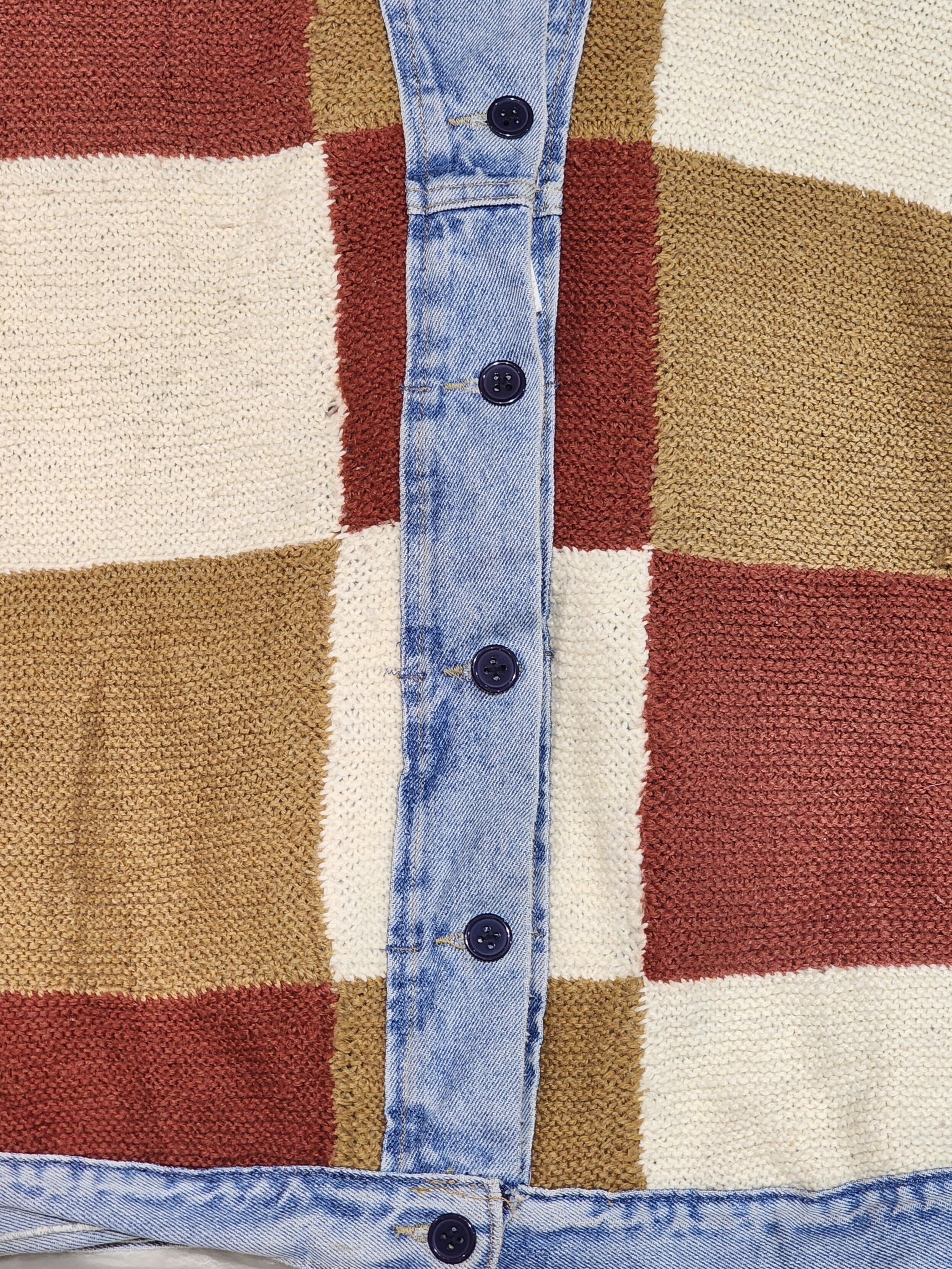 テラコッタ×オーカー×アイボリーのパッチワークニットにデニムはユーズドブルーの組み合わせがレトロで可愛い◎