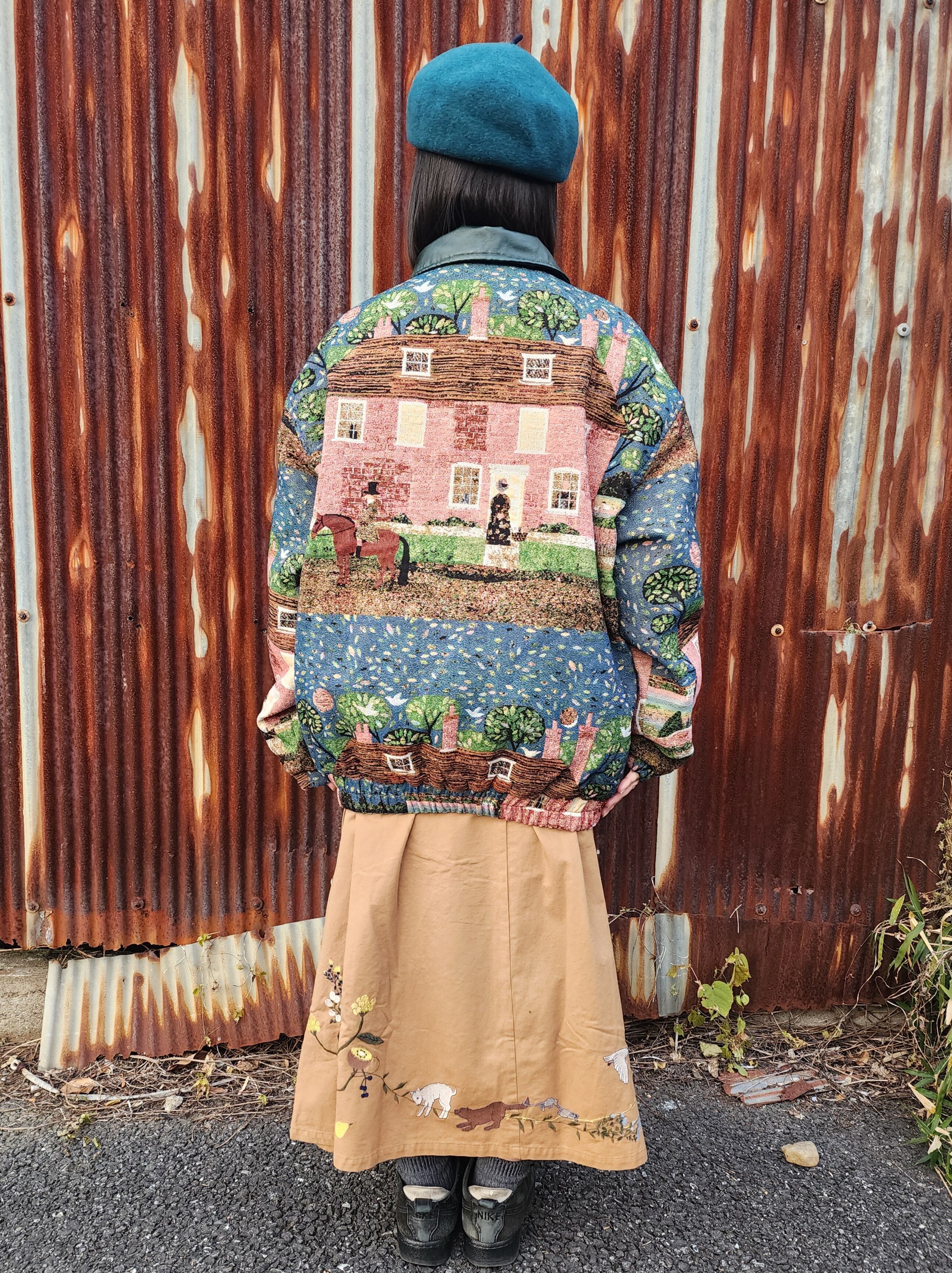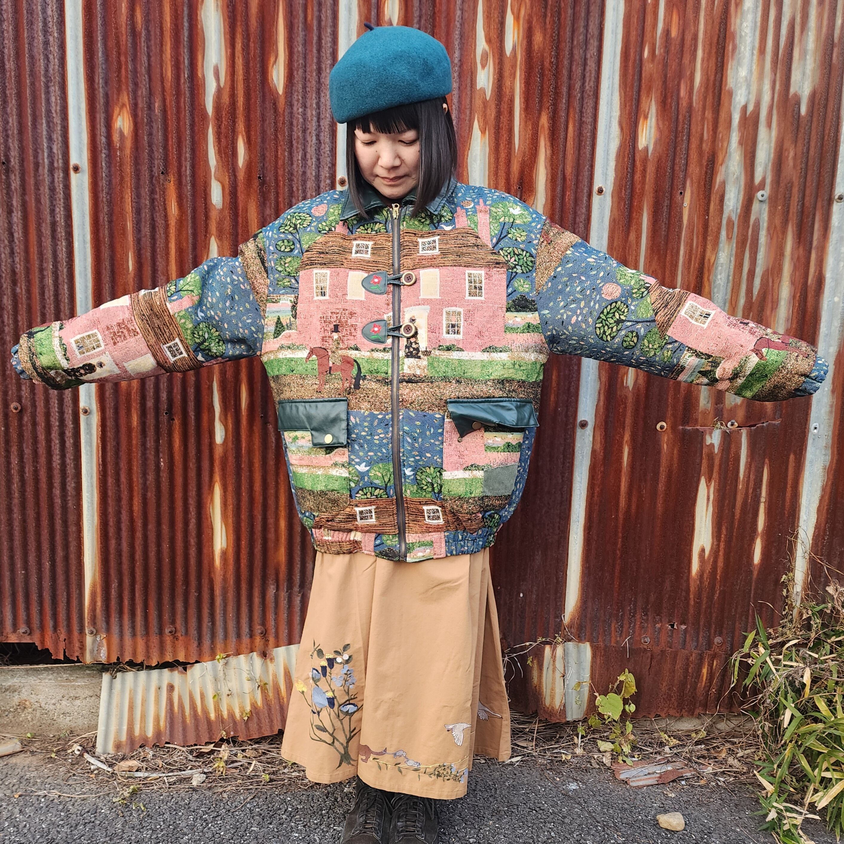ぱっと目を引く絵画の様な風景柄が個性的で素敵なブルゾン。