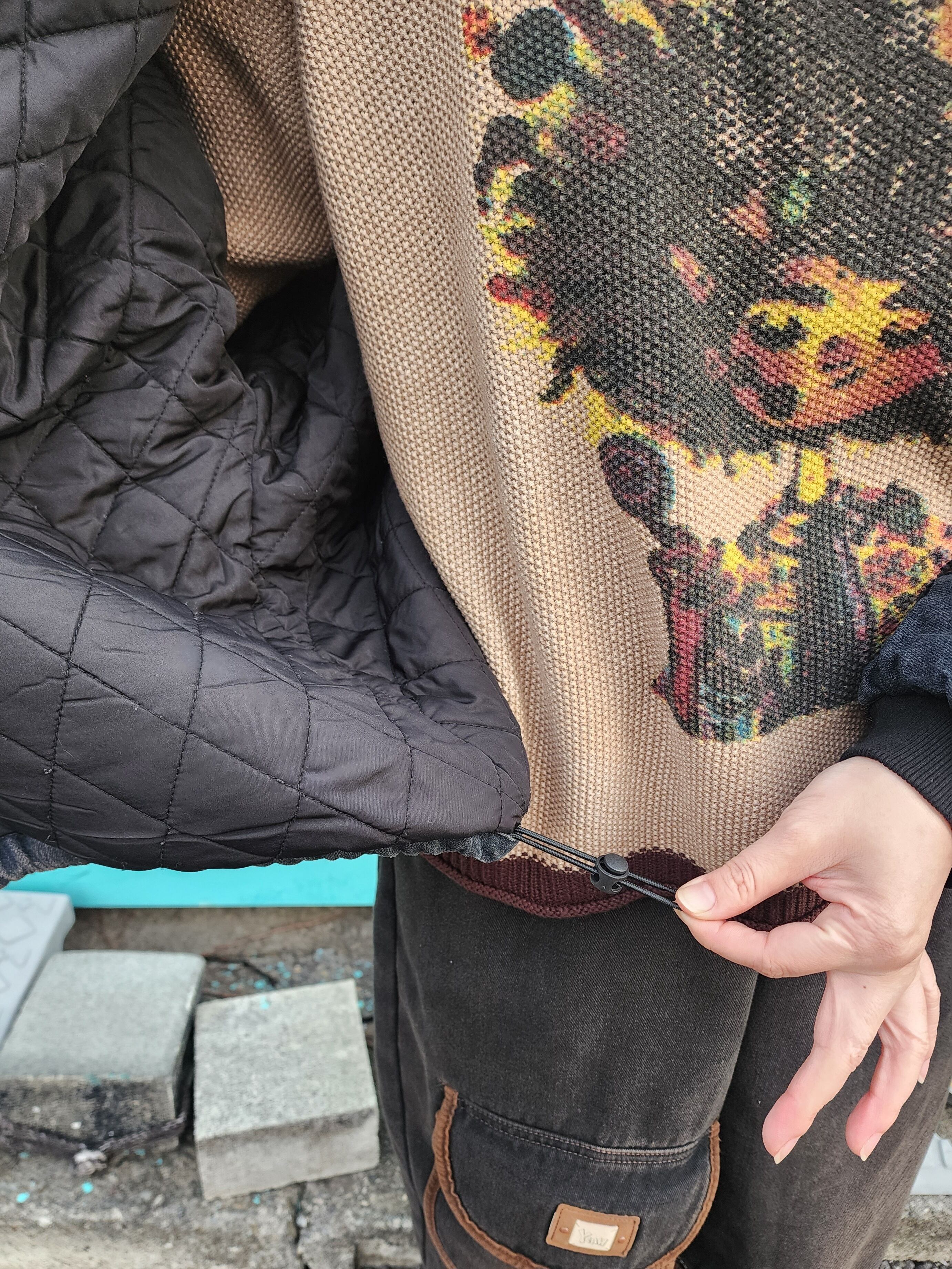 裾に紐が通っていて、裾裏のコードストッパーで絞れる仕様。
