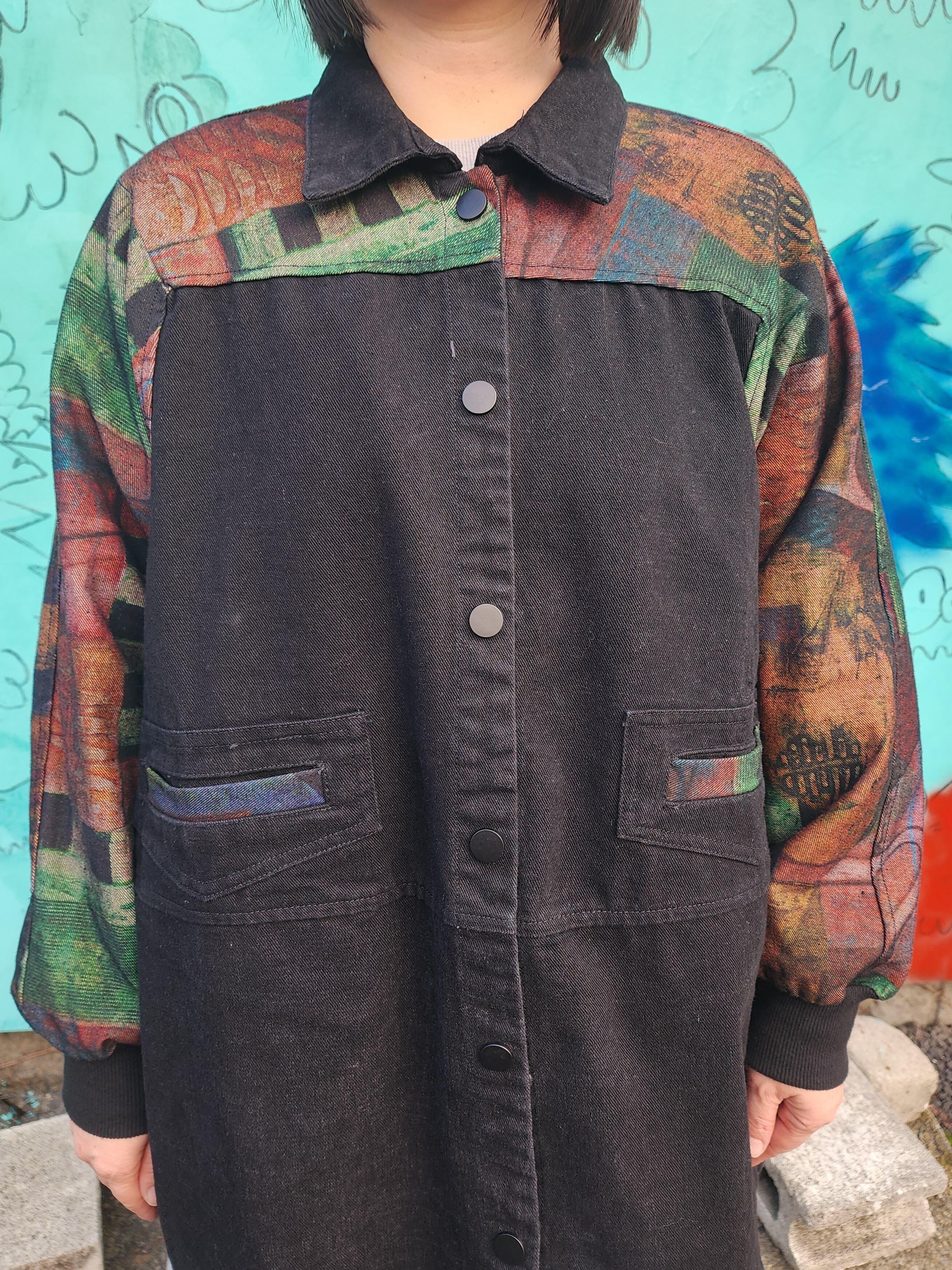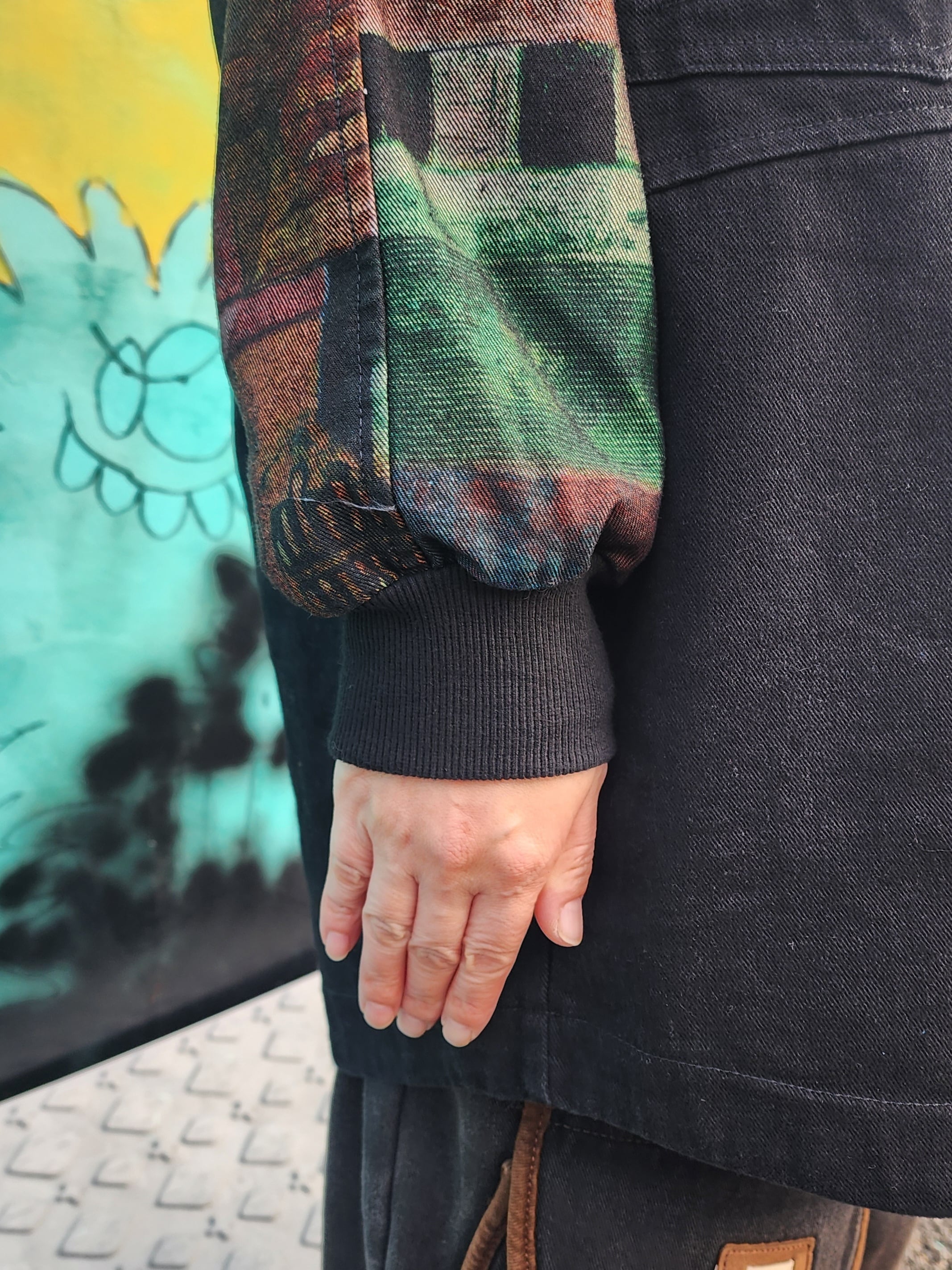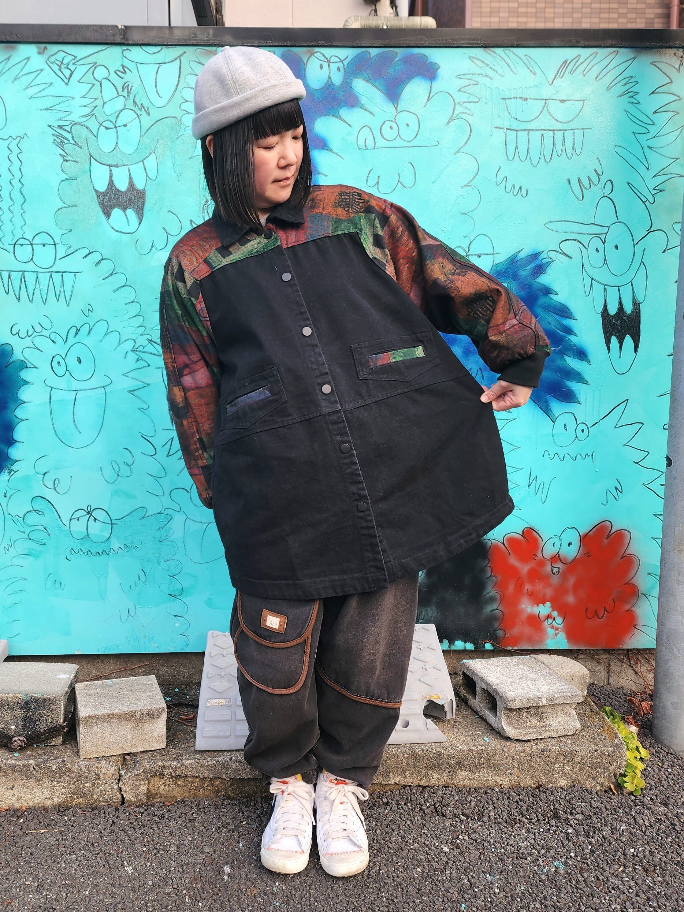 個性的なカラフルプリント×ブラックのメリハリのきいた切り替えがかっこいいジャケット。