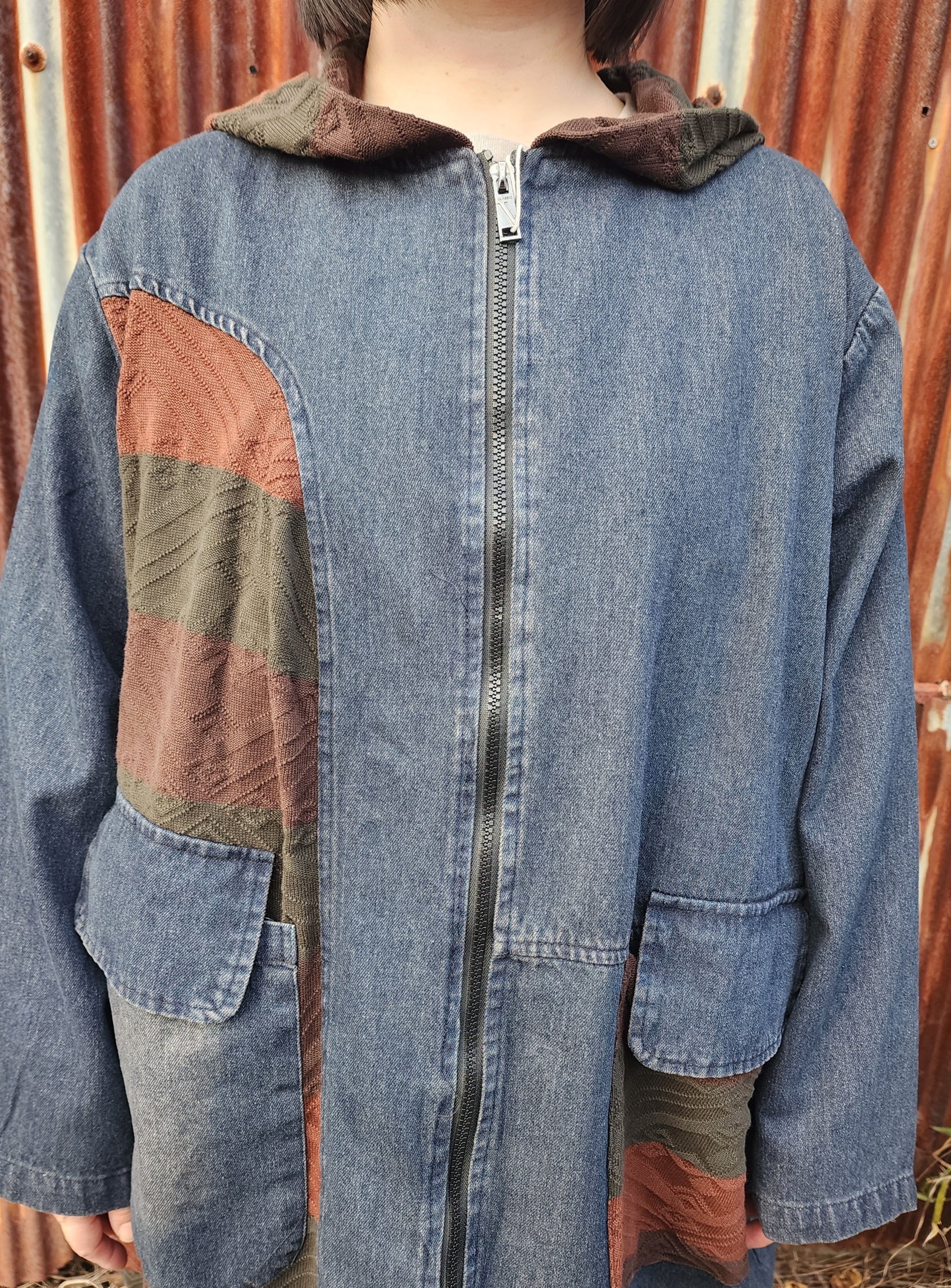 模様入りの配色ボーダーニットで切り替えたデニムコート。