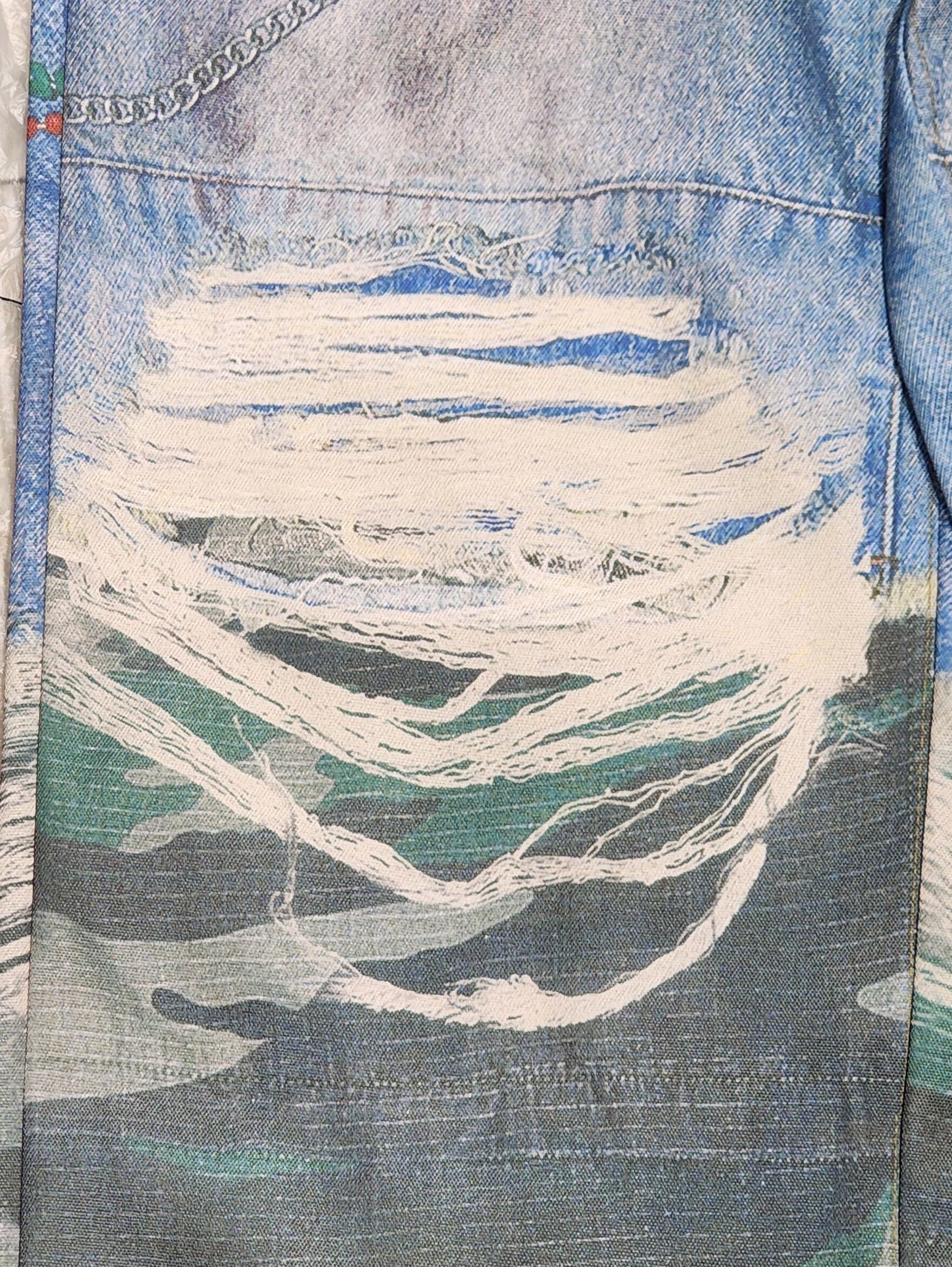 綺麗なデニムのブルーにキーチェーンや迷彩などもプリントされたユニークな一枚☆