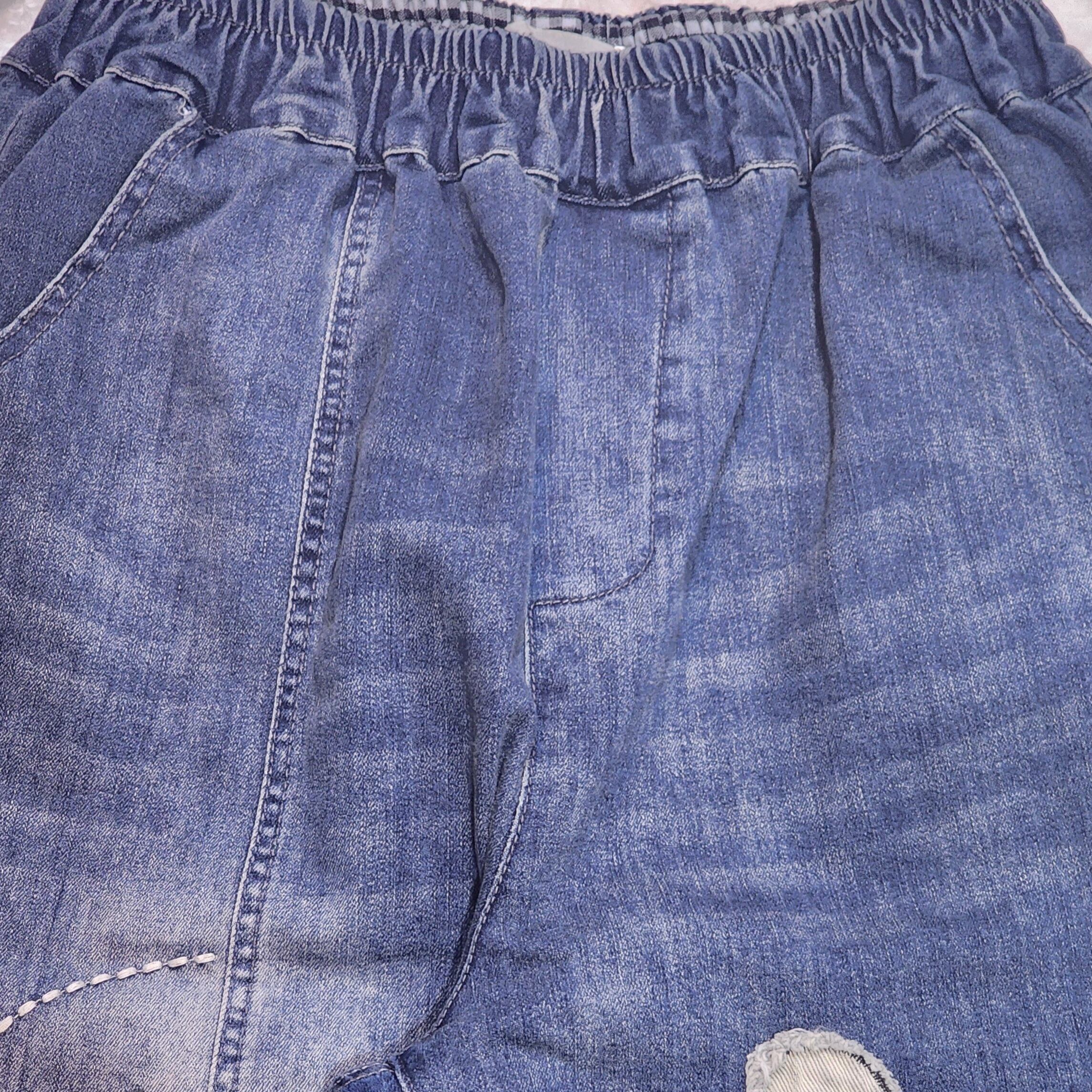 うさぎさんの刺繍パッチワークに素敵な柄のたまご刺繍が可愛いストレッチデニム。