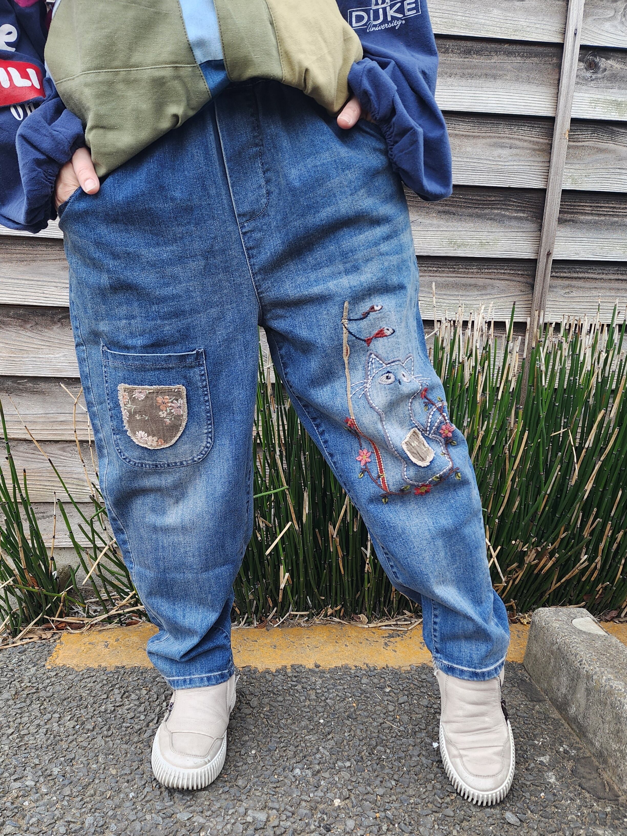 お魚釣り帰りの猫ちゃん刺繍入りストレッチデニム。
